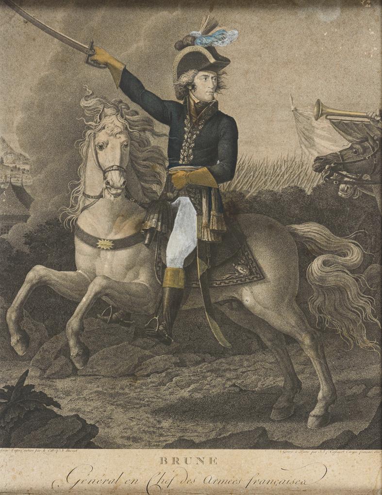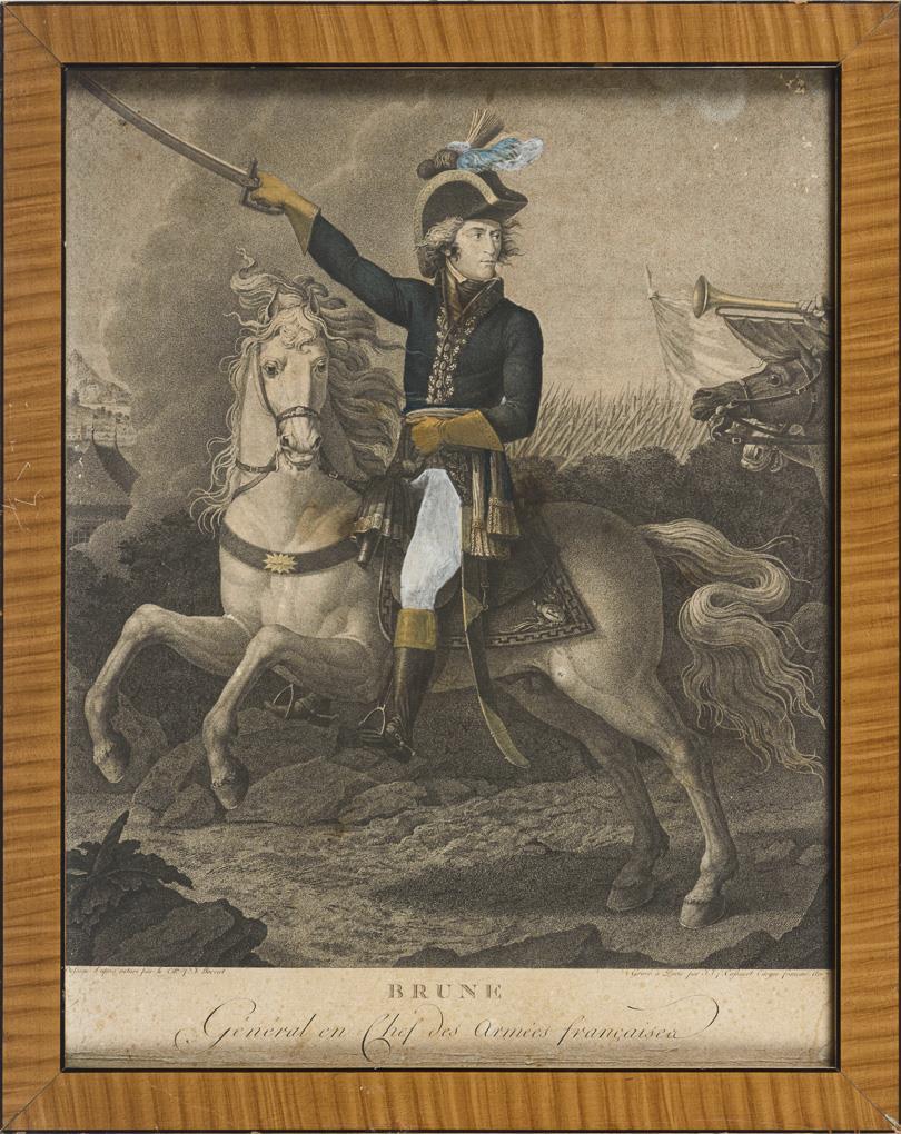 Porträt des Marschalls Guillaume Brune (1763 - 1815) als Heerführer auf einem Pferd, nach einem Gemälde von Fulchran Jean Harriet (1776 - 1805), bezeichnet "Brune, Général en chef des armées françaises". Stärker stockfleckig, etwas berieben.