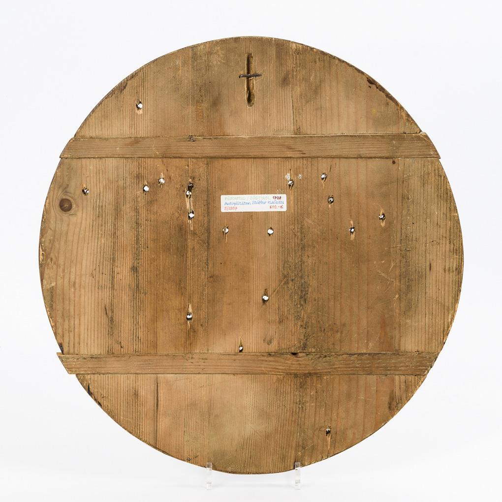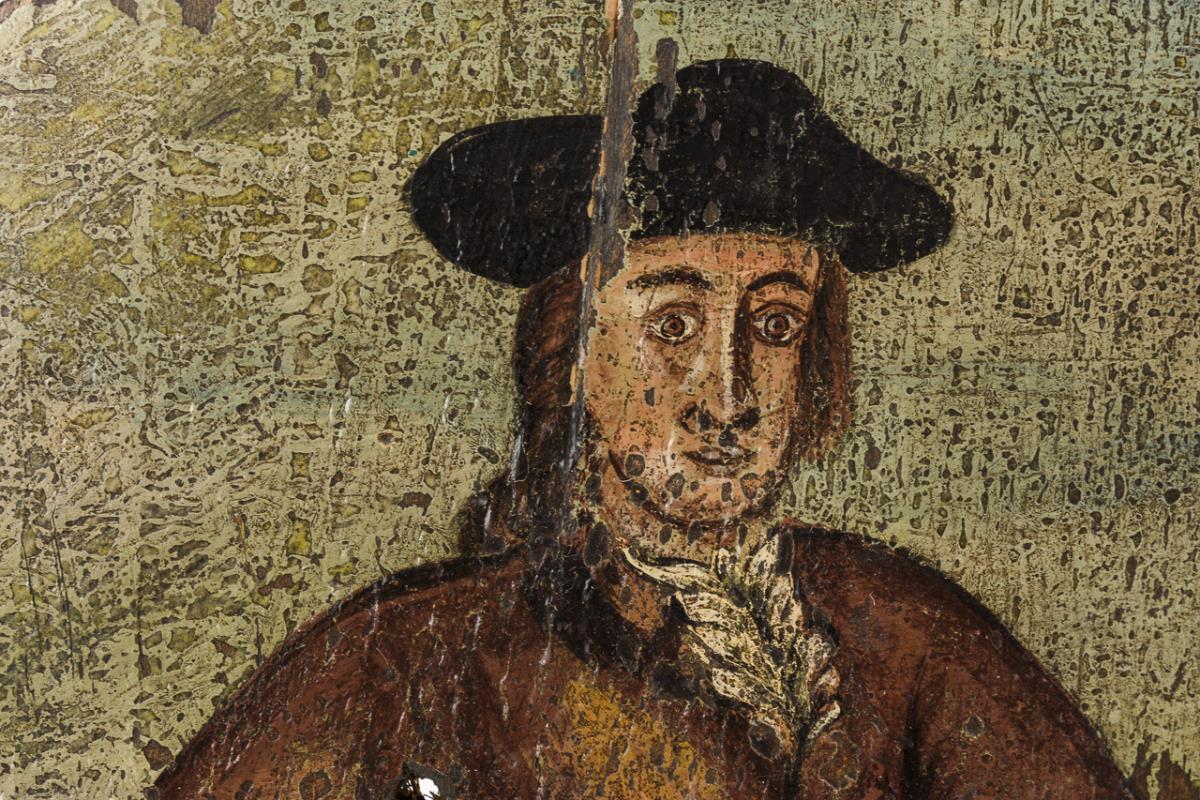 Schützenscheibe mit der Standfigur eines Mannes neben dem Gewehr; im Hintergrund eine Schießscheibe sowie etliche Einschüsse. Trockenriss, starke Alters-/Gebrauchsspuren.