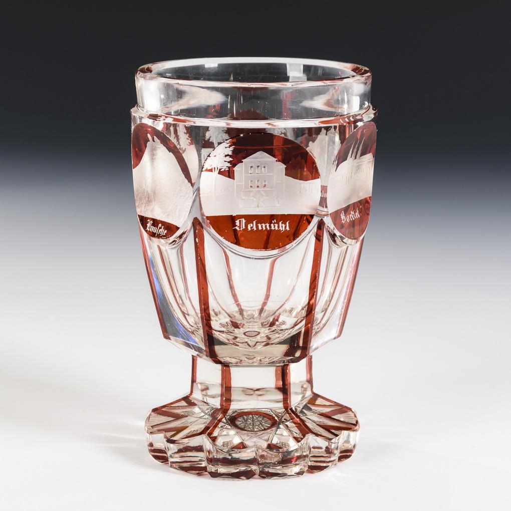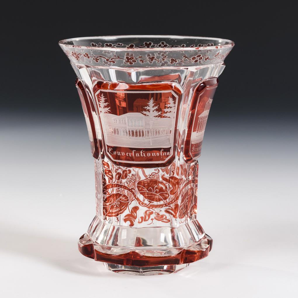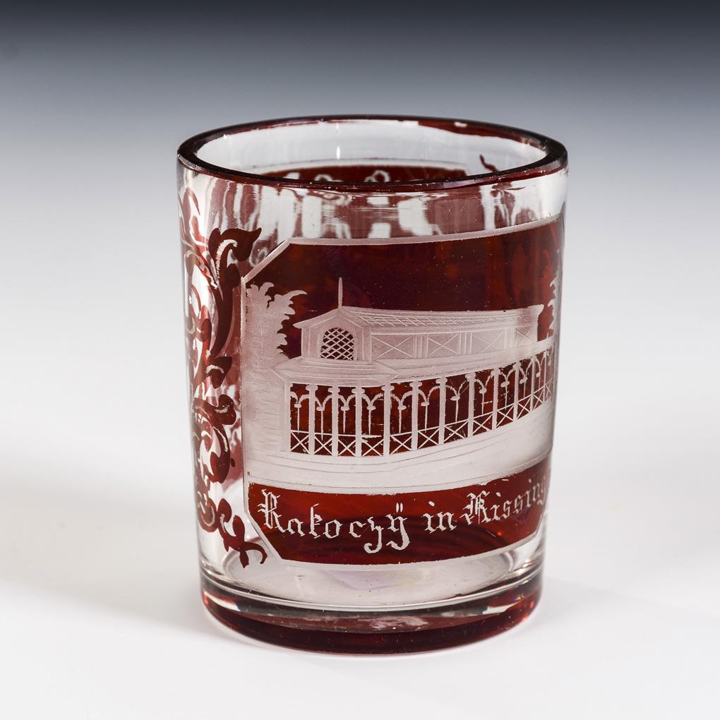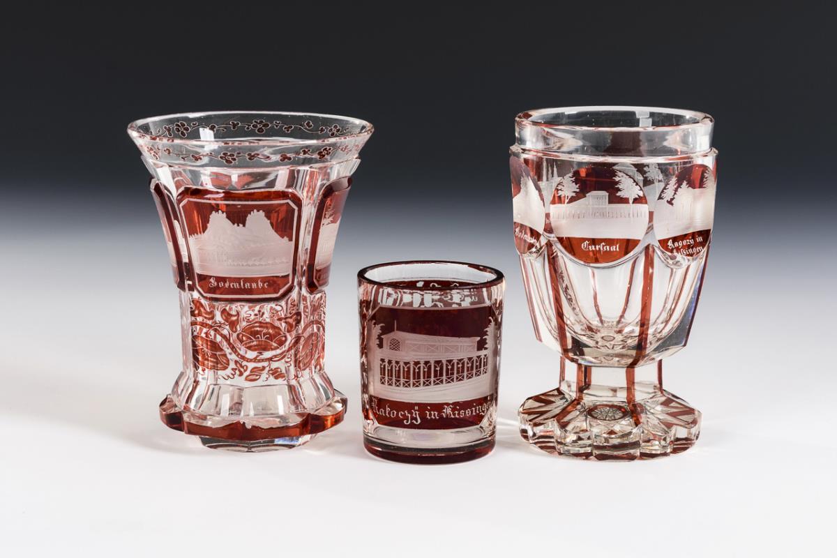Kleiner Zylinderbecher, Kraterbecher und Fußbecher. Alle mit gravierten, bezeichneten Ansichten von Bad Kissingen. 2x Fußränder und 1x Mündungsrand minimal bestoßen.