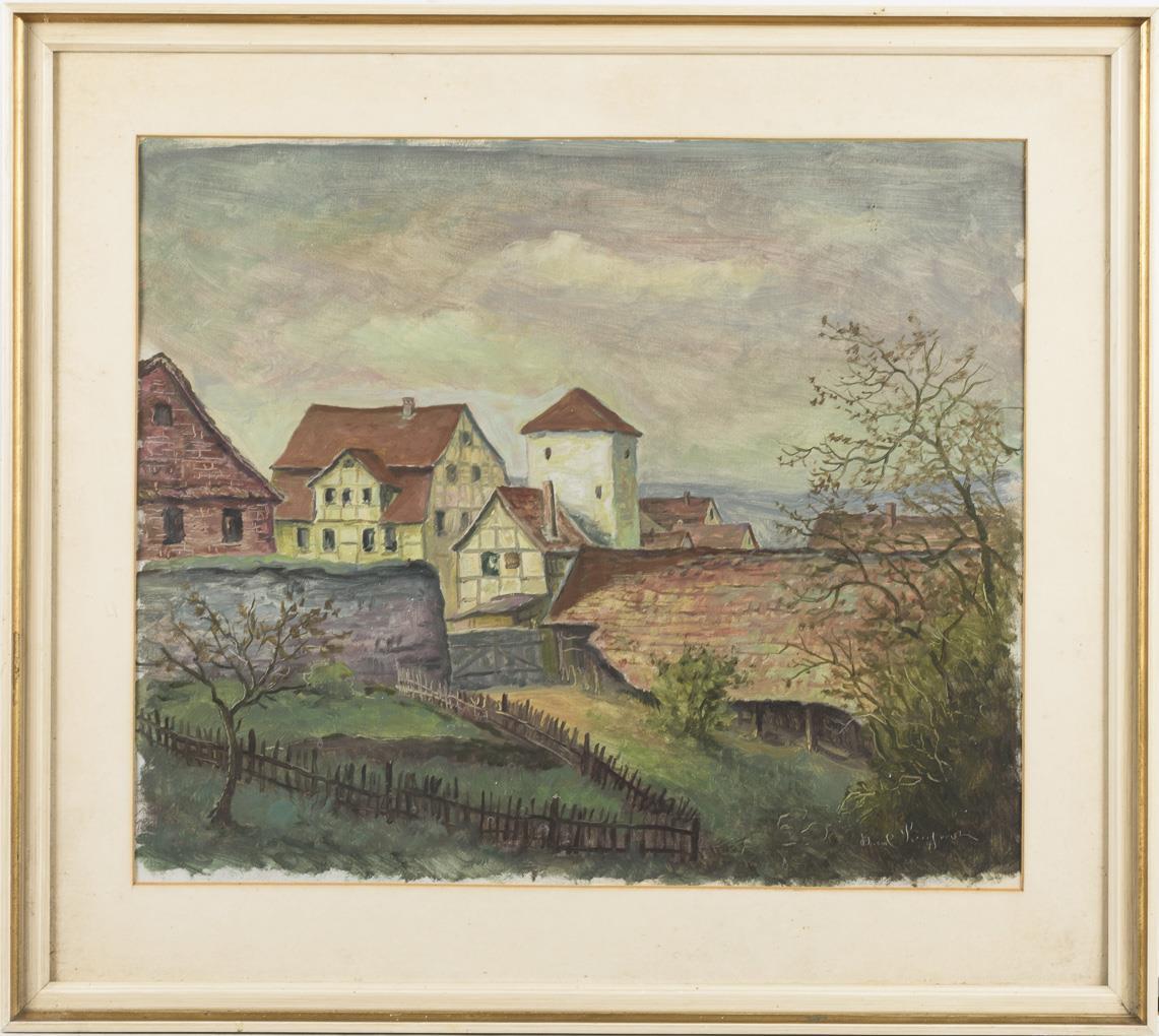 Dicht stehende Fachwerkhäuser mit Turm unter grauem Himmel. Minimale Altersspuren.