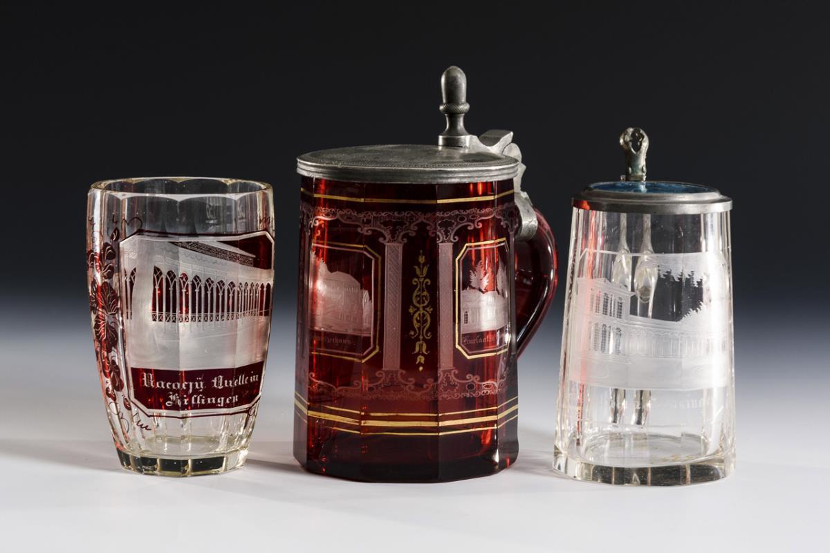 Henkelbecher sowie 2 Krüge mit zinnmontiertem Scharnierdeckel. Alle mit gravierten, bezeichneten Ansichten von Bad Kissingen. Mündungsränder minimal bestoßen, Kratzspuren.