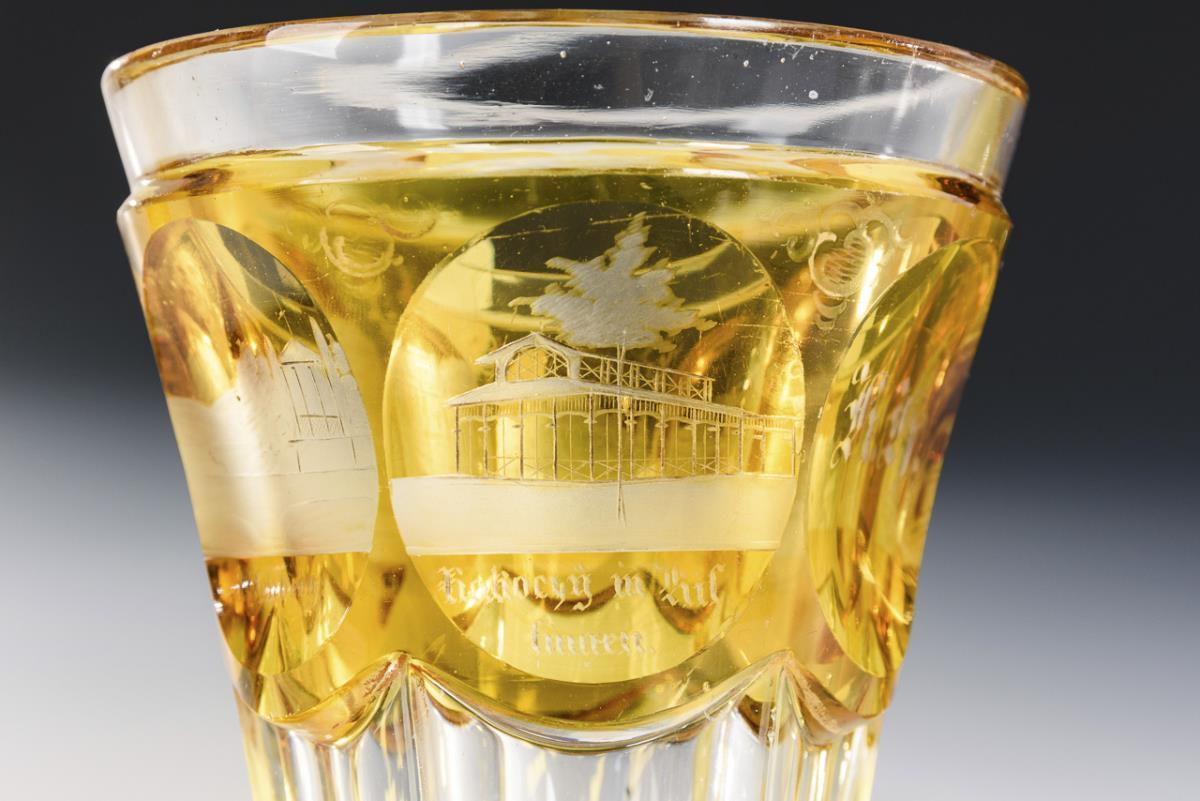 2 Kraterbecher und 1 Fußbecher. 2x mit gravierten, bezeichneten Ansichten von Bad Kissingen, 1x mit der aus gravierten Blütenranken gebildeten Aufschrift "Bad Kissingen". 1x beriebene Goldstaffage, 1x Bestoßung am Fußrand.