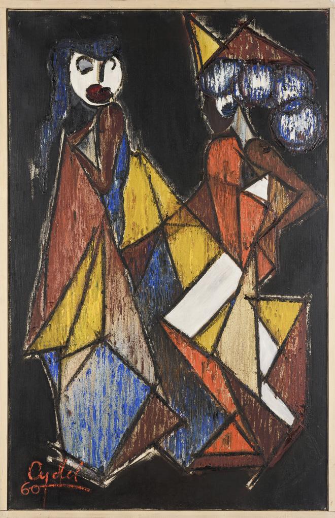 Zwei abstrakte Frauenfiguren in bunten Kleidern vor schwarzem Hintergrund.