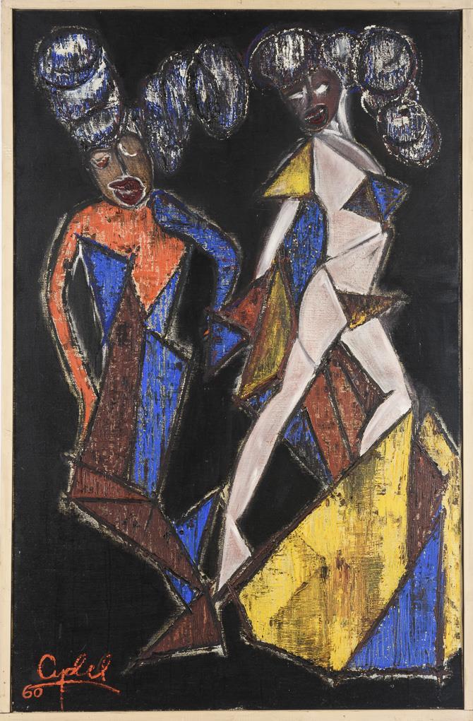 Zwei abstrakte Frauenfiguren in Bikini und buntem Kleid.