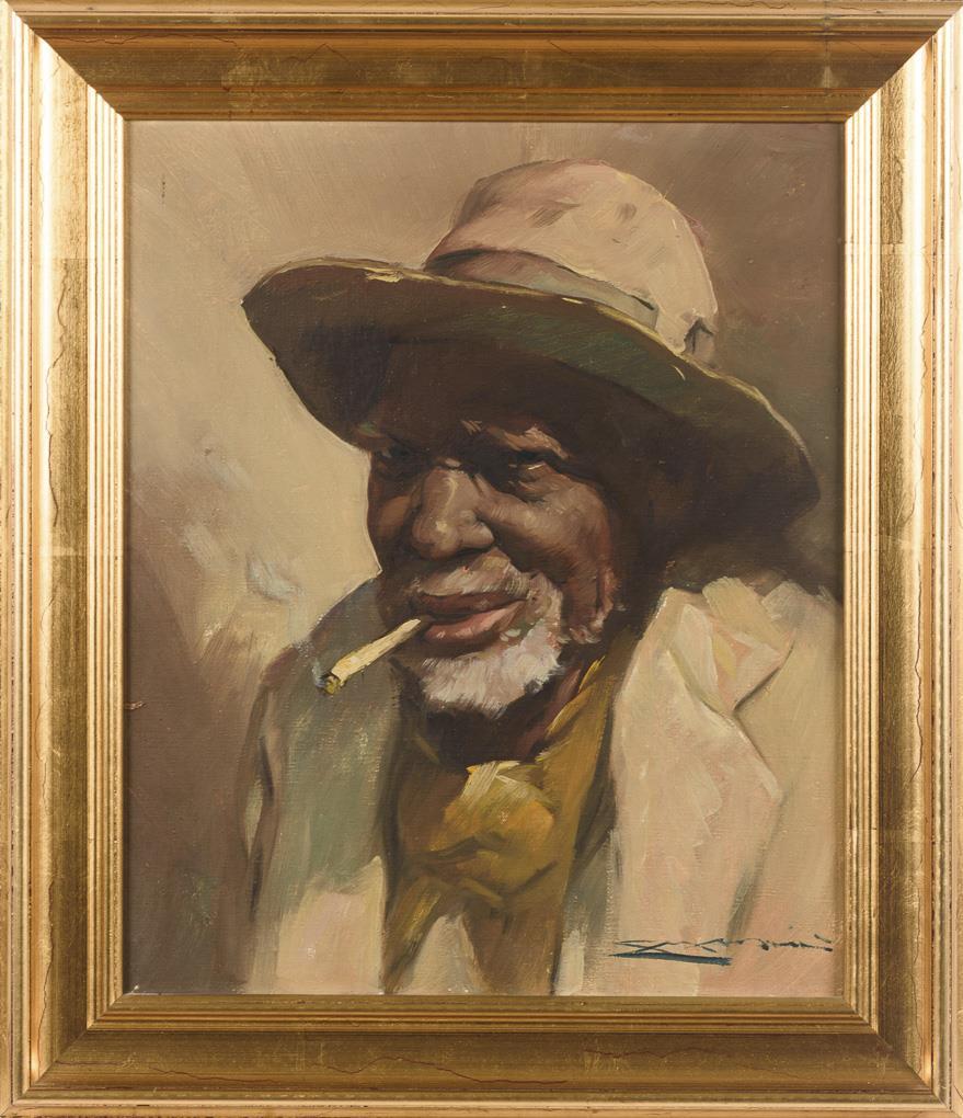 Charakterbildnis eines afroamerikanischen Mannes mit Zigarette. Minimale Altersspuren.