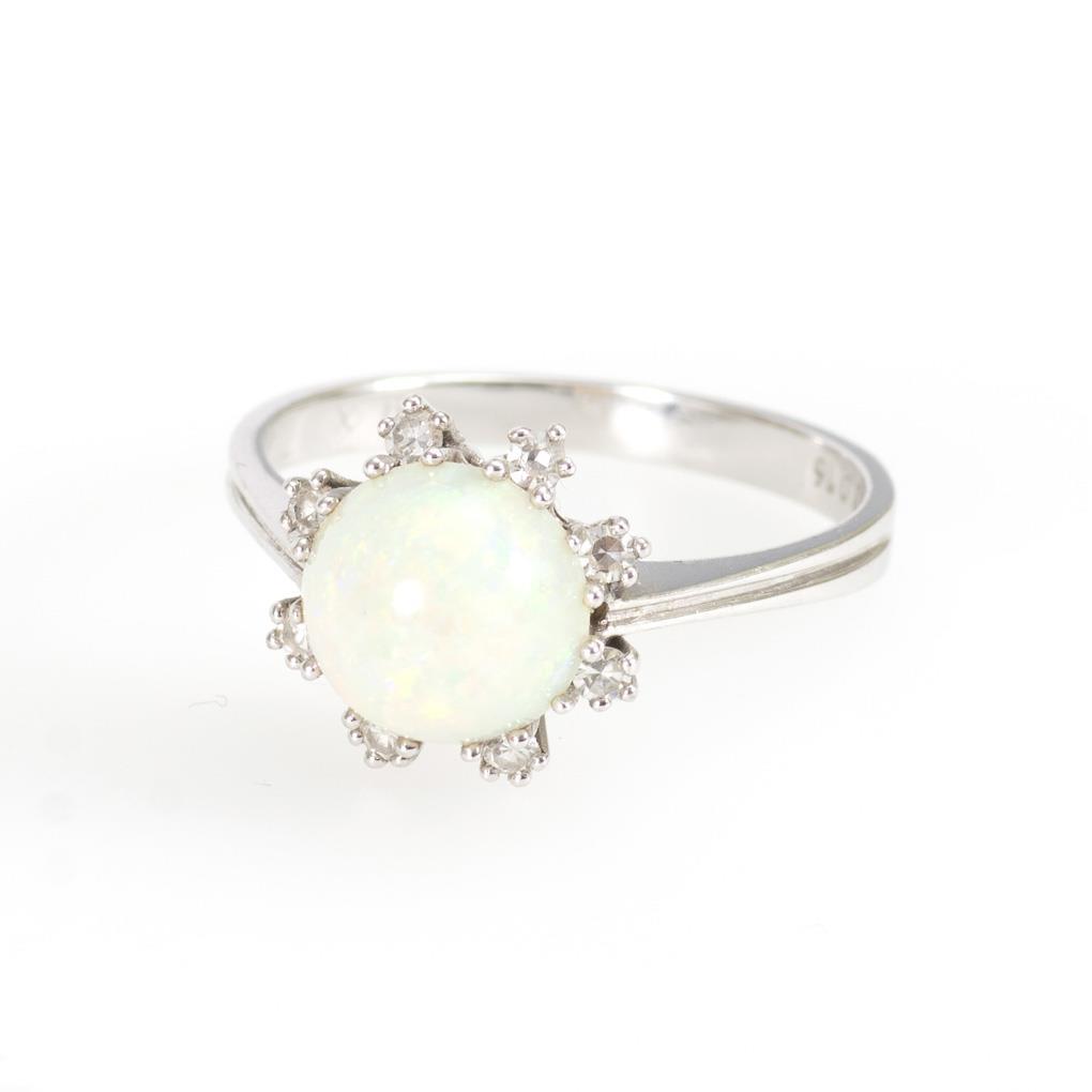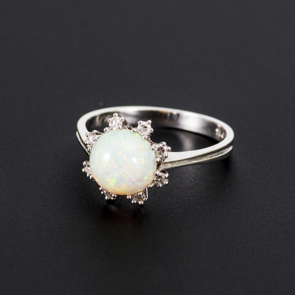 Opalcabochon, umringt von kleinen Diamanten, zwischen schmaler Schiene.