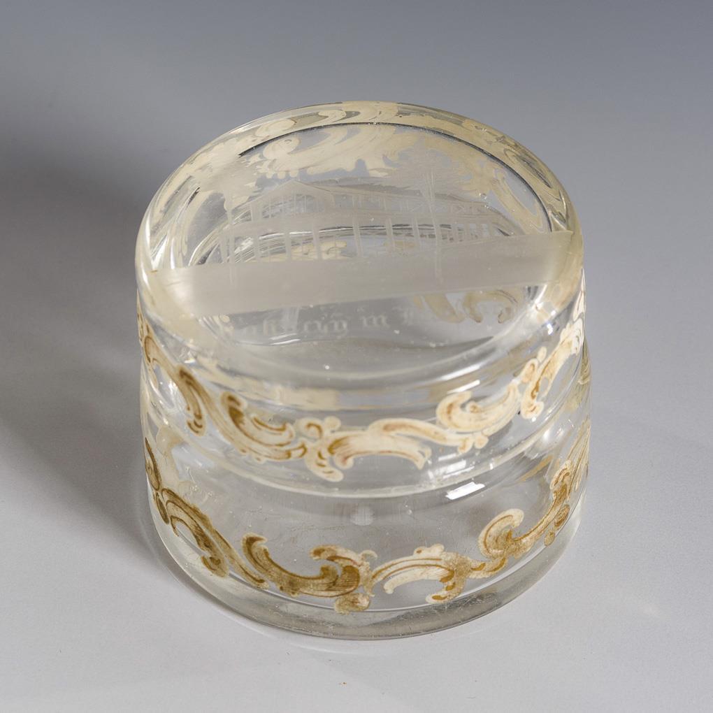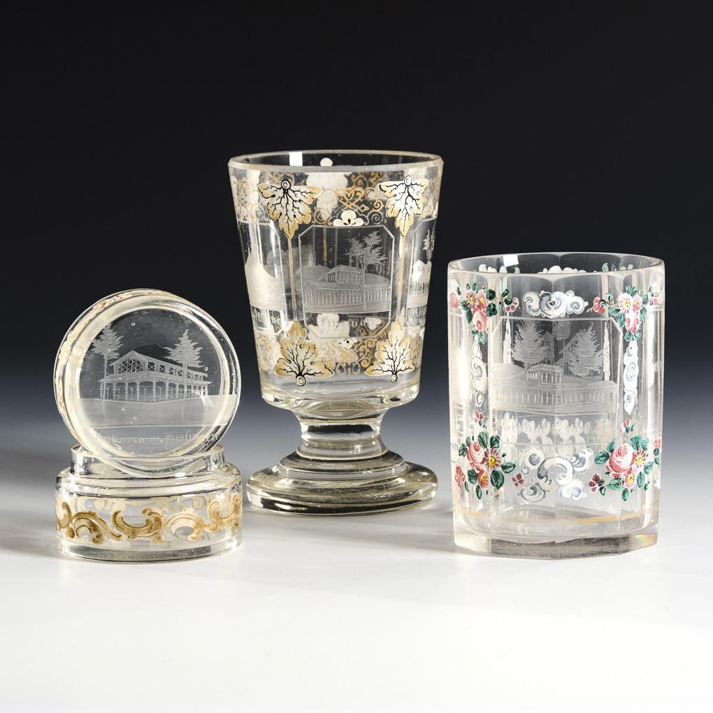 Facettierter Zylinderbecher, Fußbecher und Zylinderdose. Mit Floral- bzw. Rocaillemalerei sowie gravierten, bezeichneten Ansichten von Bad Kissingen. Chip am Rand des Dosendeckels, Kratzspuren.