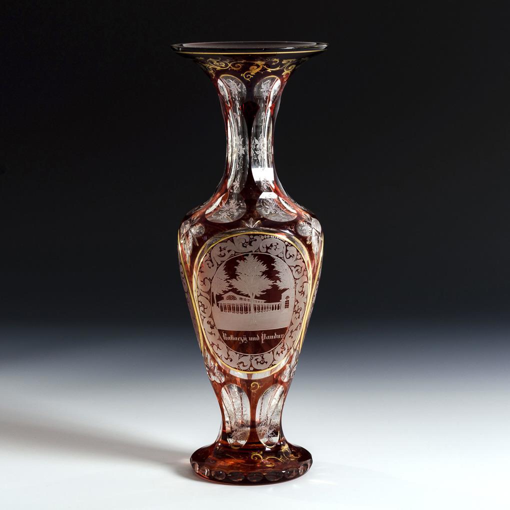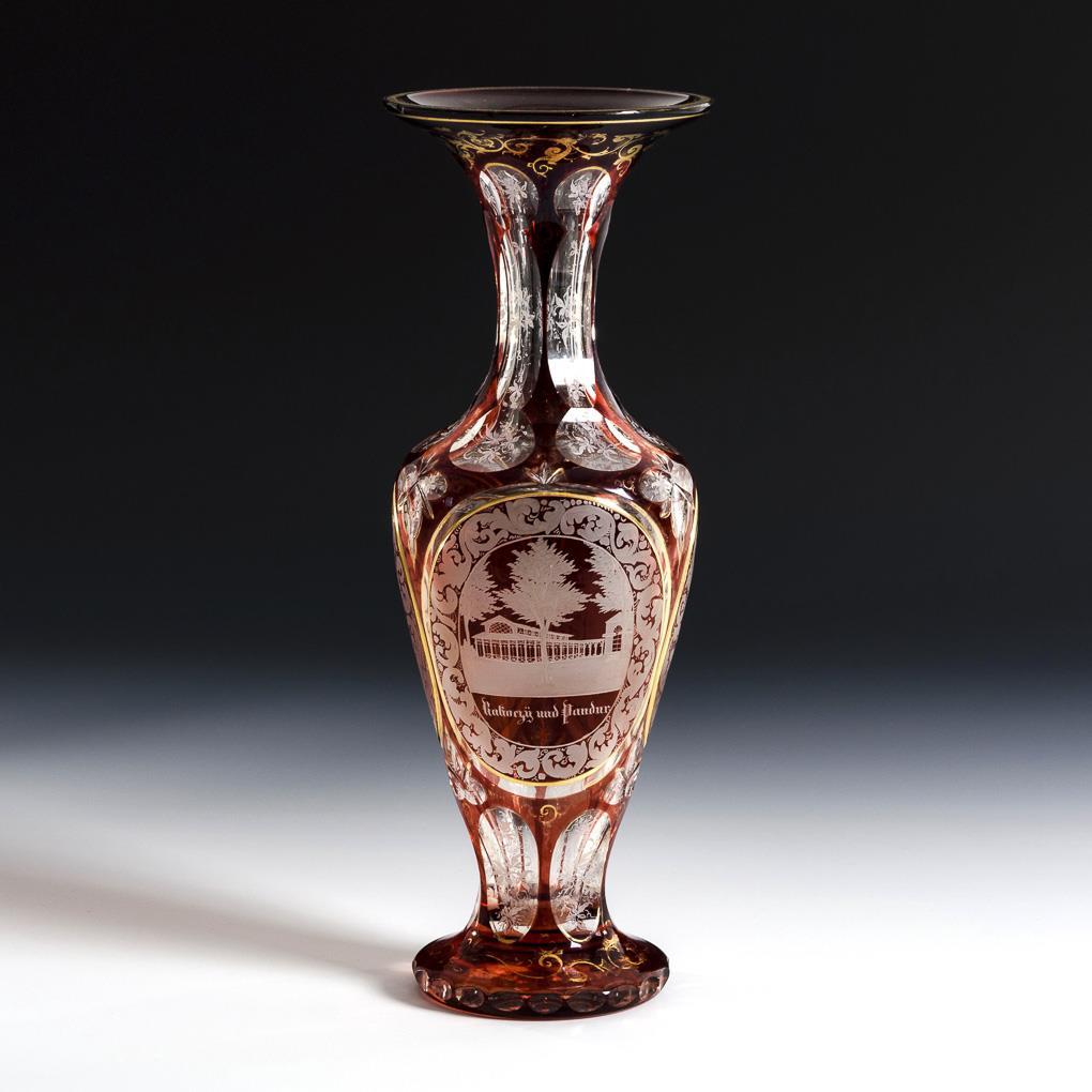 Farbloses, rot gebeiztes Glas, Goldstaffage. H 33,5 cm.