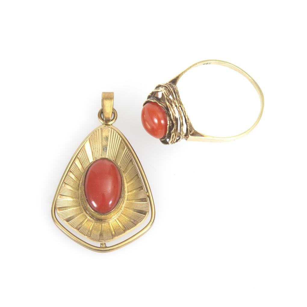 Anhänger und Ring mit Korallencabochon. Schmale Schiene.