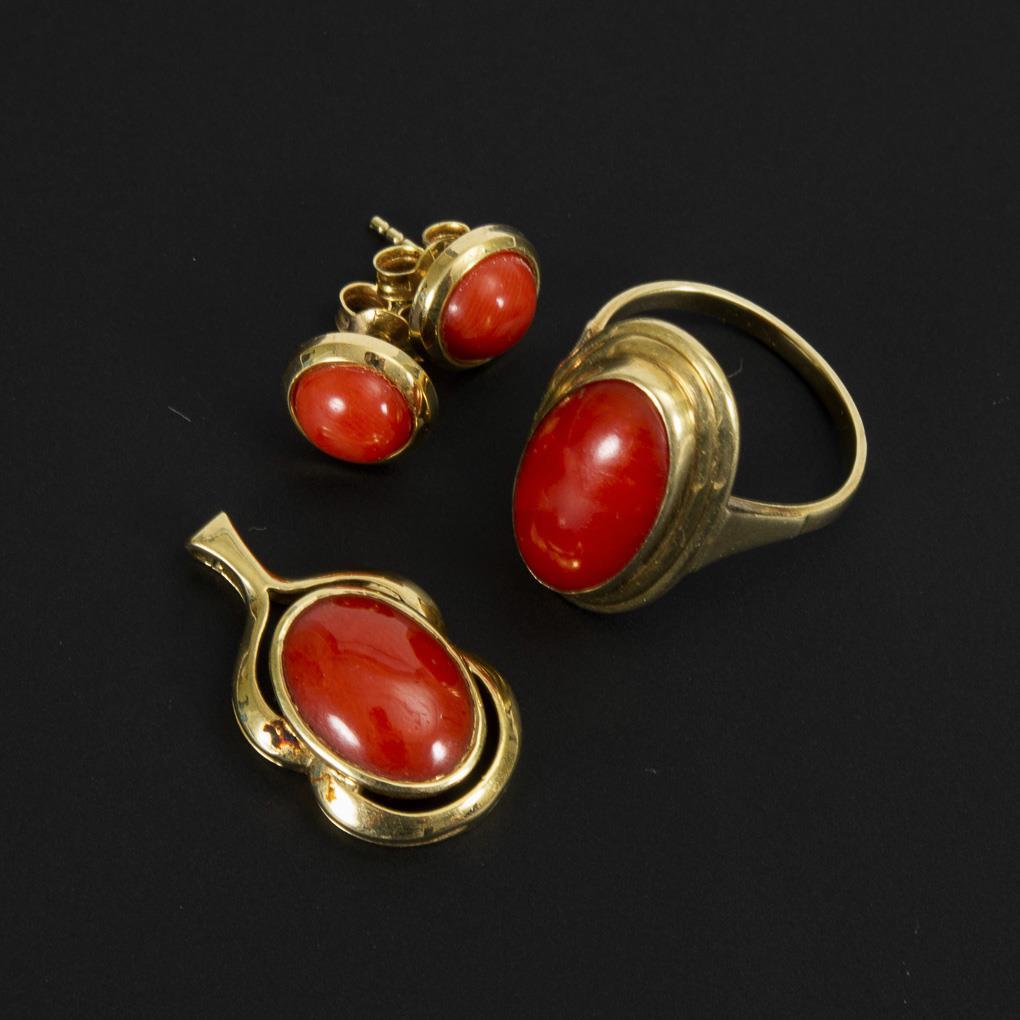 Anhänger, Ring und Ohrsteckerpaar mit zargengefassten Korallencabochons. Starre Öse, schmale Schiene und Steckmechanik.