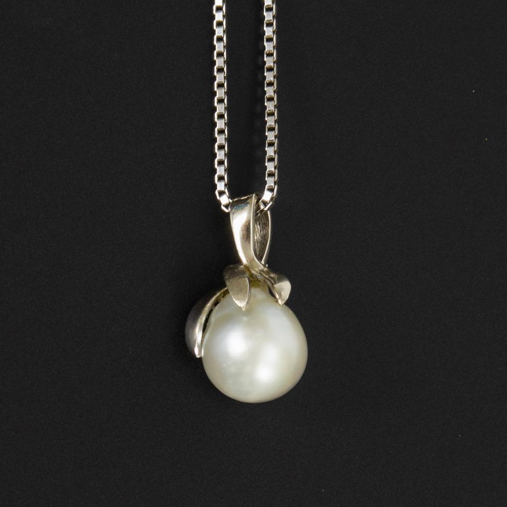 An starrer Öse gefasste Zuchtperle. Venezianerkette mit Ringfederschließe.