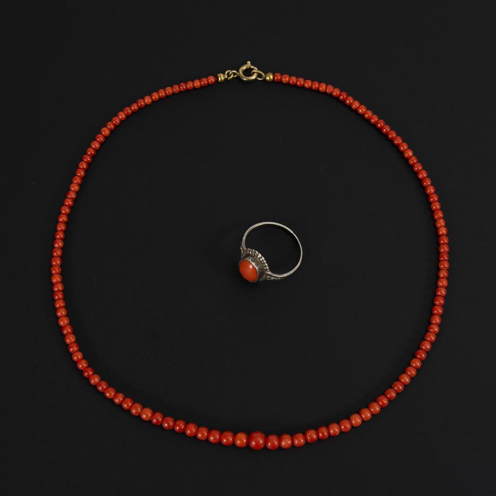 Schnürkette mit kleinen Korallenkugeln im Verlauf, an Metall-Ringfederschließe. Ring mit Korallencabochon zwischen schmaler Schiene.