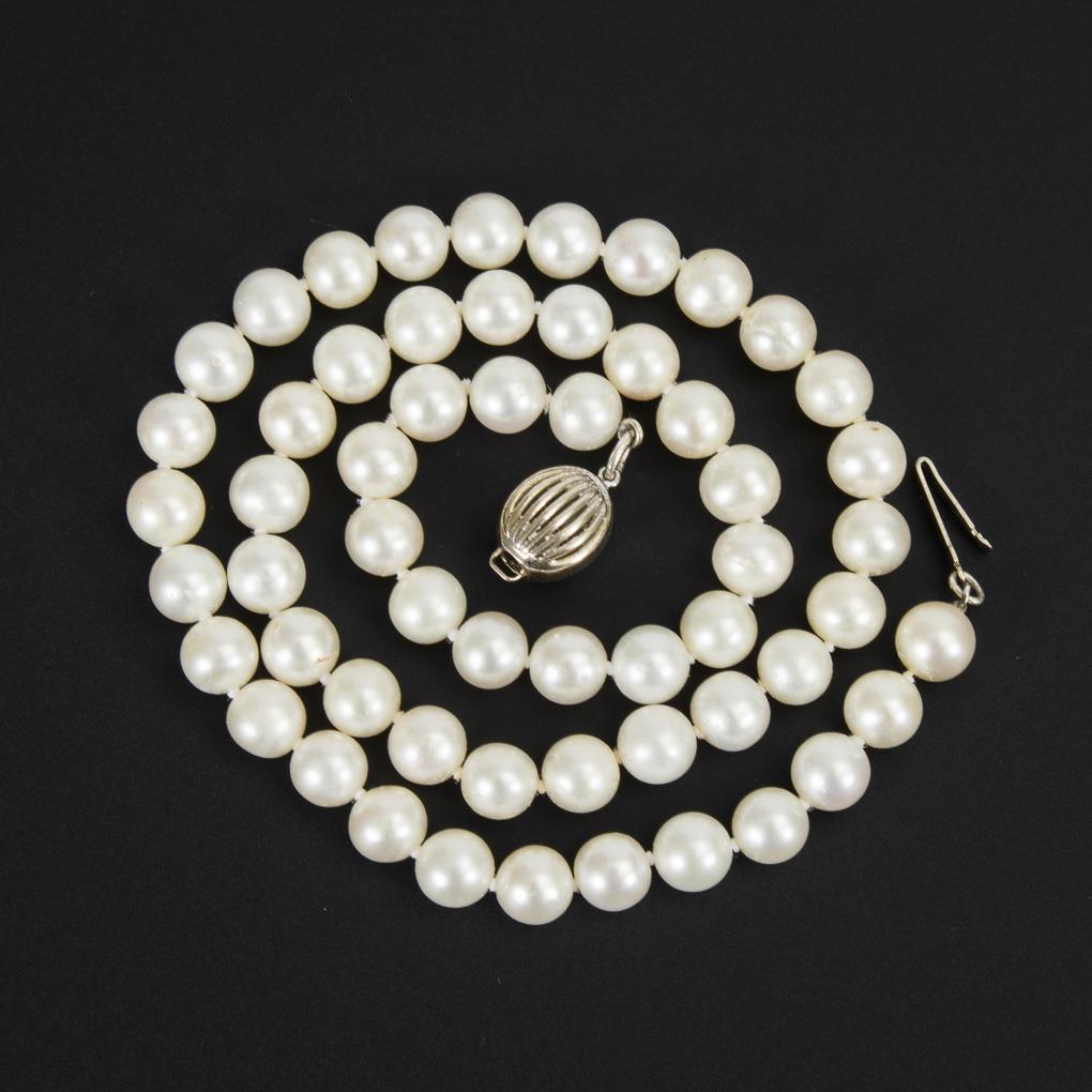 Schnürkette mit Zuchtperlen in Einzelverknotung, an Weißgoldschließe.