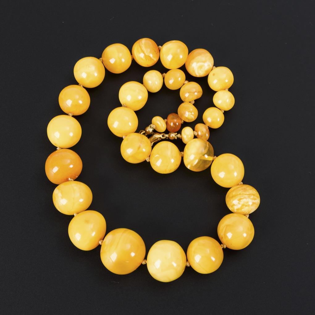 Schnürkette mit Bernsteinkugeln im Verlauf, einzelverknotet. Metall-Karabinerschließe.