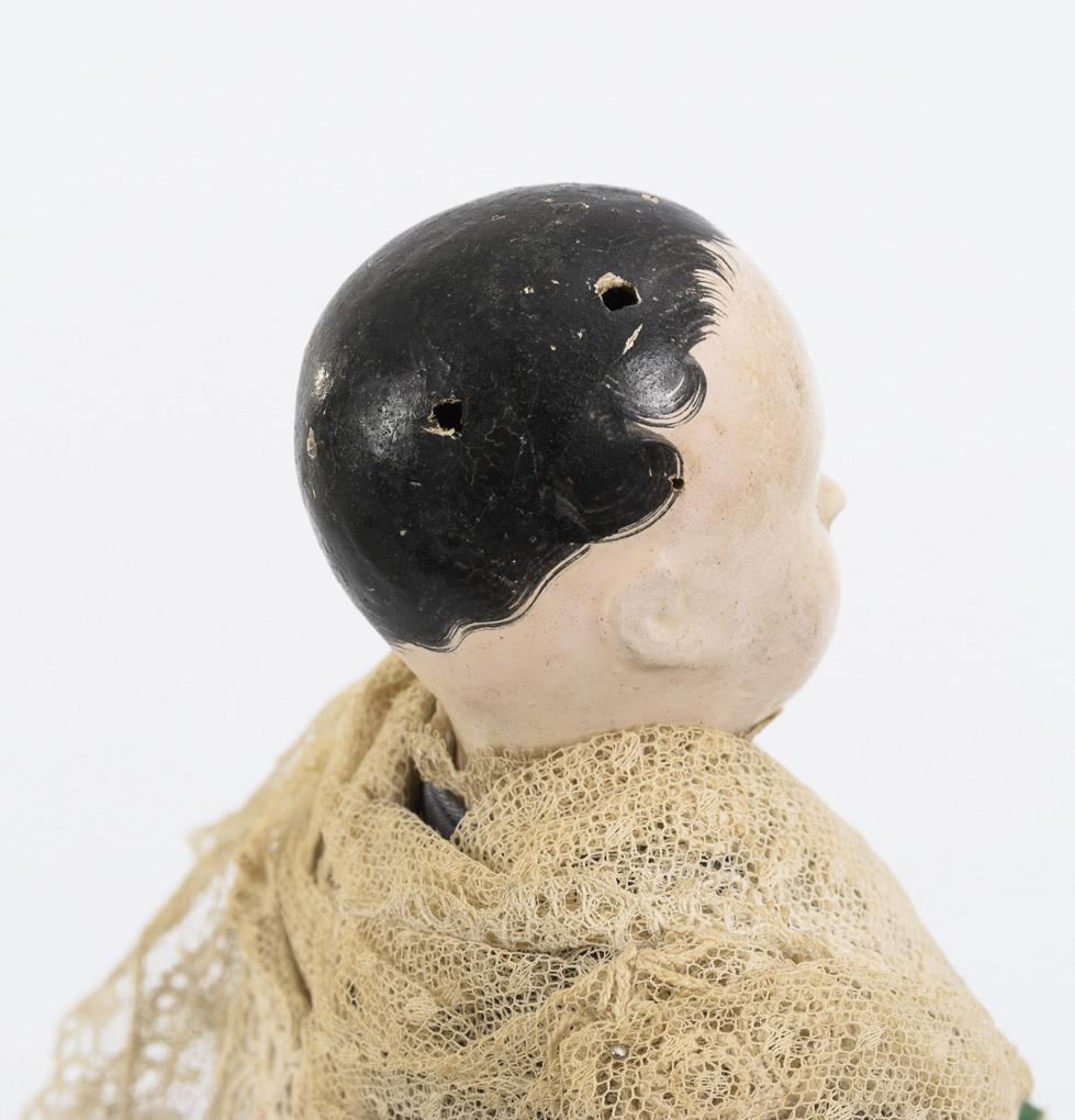 Im Stil einer Pauline. Bemalter Masse-Vollkopf mit schwarzen gemalten Haaren, dunkle, pupillenlose Glasaugen, offener Mund mit Bambuszähnchen. Originale Echthaarperücke. Steifer, leicht rosa getönter Lederkörper mit genähten Fingerchen. Originalkleidung aus blaugrauer Seide mit feinen Spitzen, sehr hohe Haube, originale Unterkleidung, Strümpfe und Schuhe. Guter Zustand, am Hinterkopf 4 Löcher (Nagelspuren?), leichte Altersspuren am Seidenkleid (Puppe kann nicht ausgezogen werden).