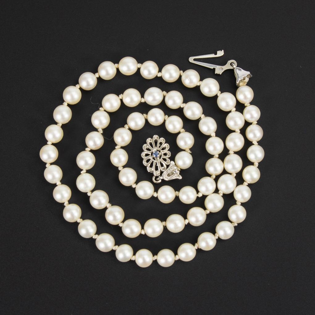 Schnürkette mit Zuchtperlen in Einzelverknotung, an Zierschließe mit kleinem Saphir.