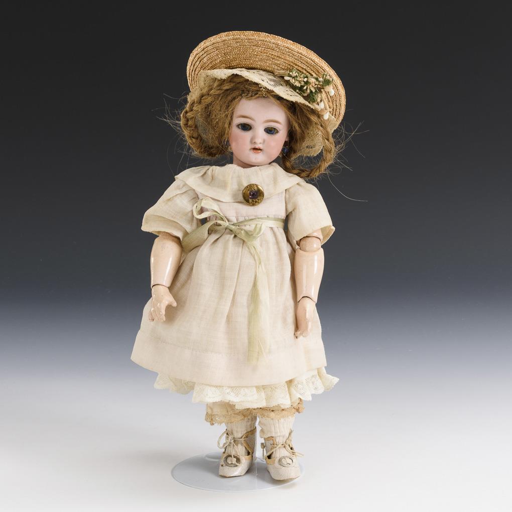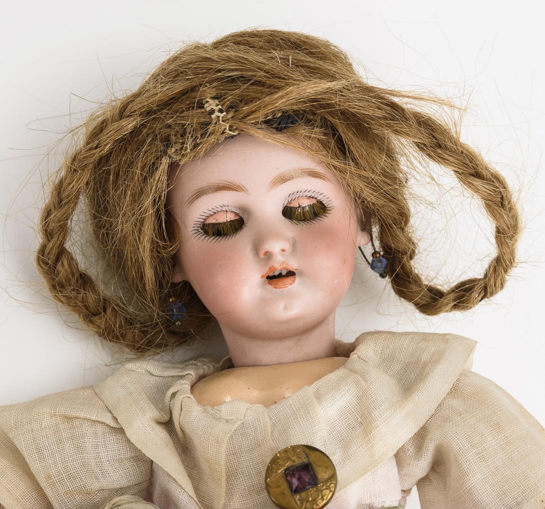 Kurbelkopf, blaue Schlafaugen mit Echthaarwimpern, offener Mund mit Zähnchen, vermutlich originale Echthaarperücke, Ohrringe. 17-teiliger Gliederkörper. Altes Kleidchen, Strohhut, Unterwäsche, Schuhe und Söckchen. Kopf durchleuchtet: ohne Defekte, lediglich minimaler Produktionsfehler an der Kopfkrone.