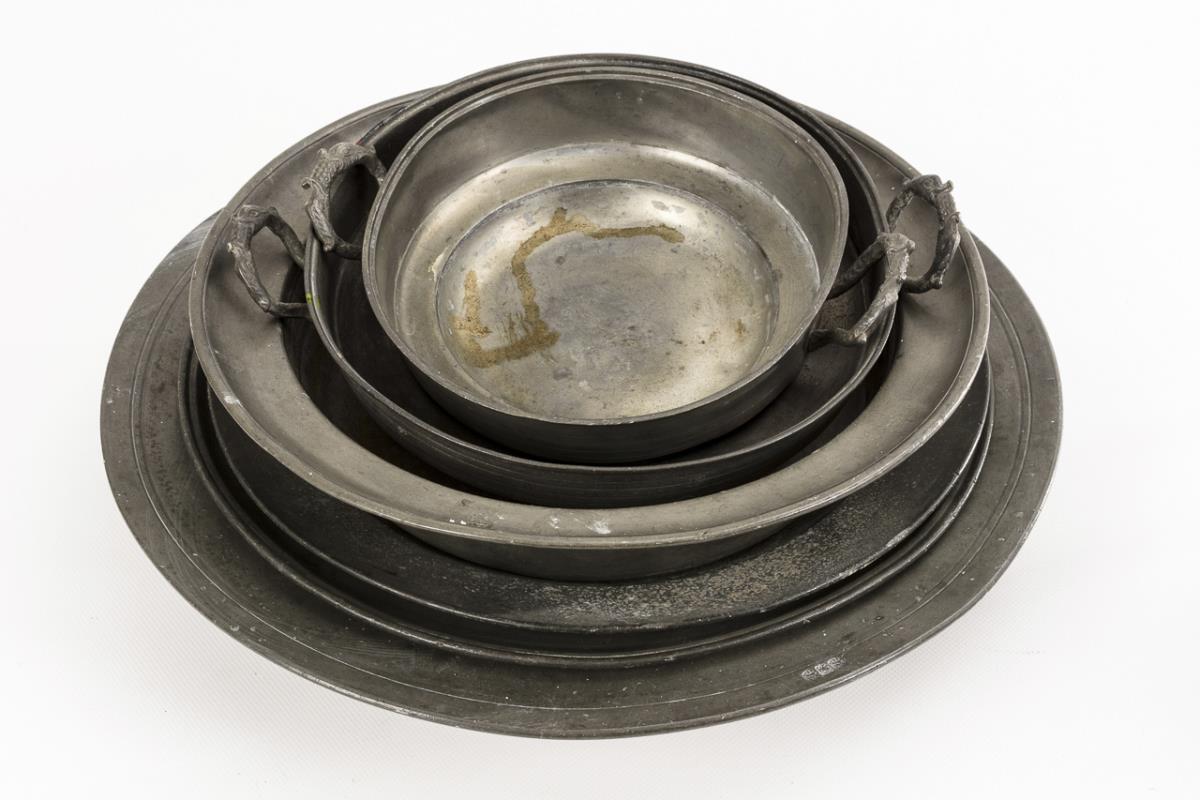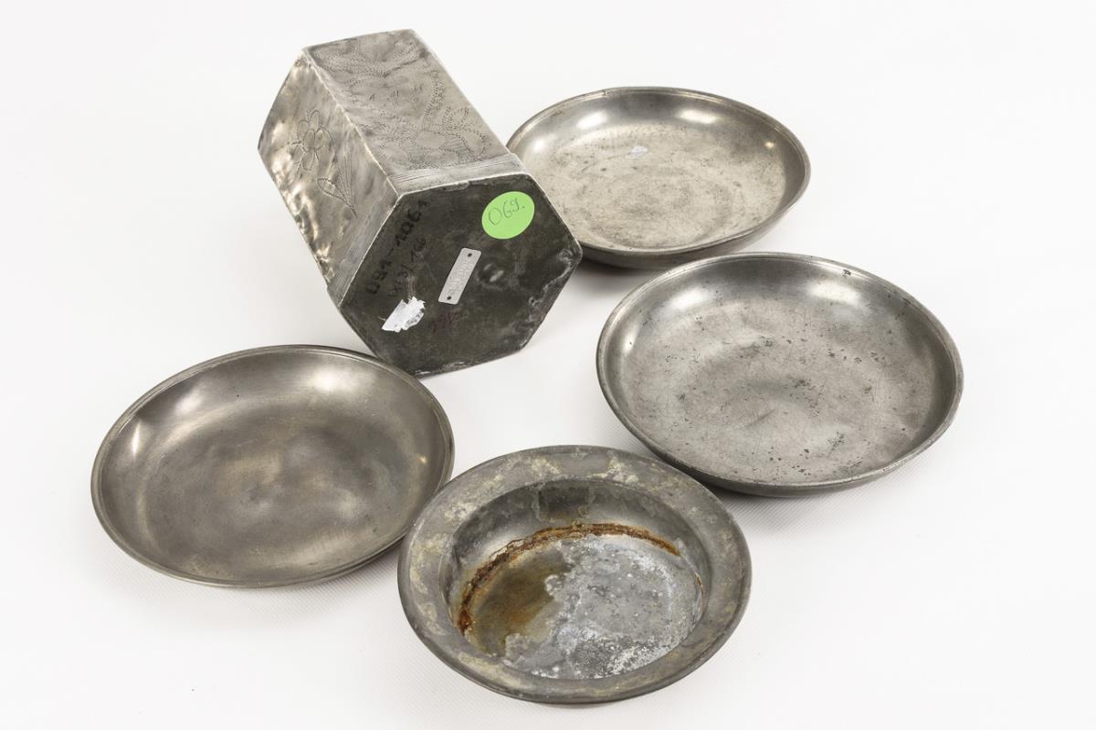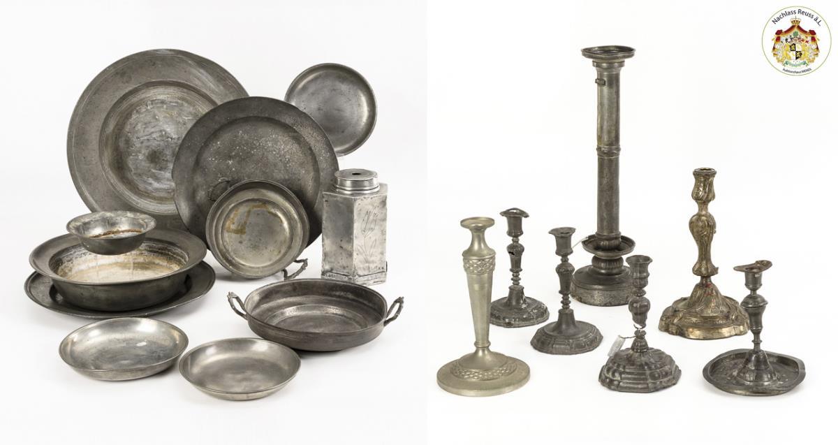 Verschiedene Schalen, Schüsseln und Teller, 1 Sechskantflasche mit Gravur, verschiedene Leuchter, darunter ein Paar sowie 1 Bronzeleuchter im Barock-Stil mit silberfarbenem Überzug. Häufig Defekte und Fehlstellen, je Alters-/Gebrauchsspuren.