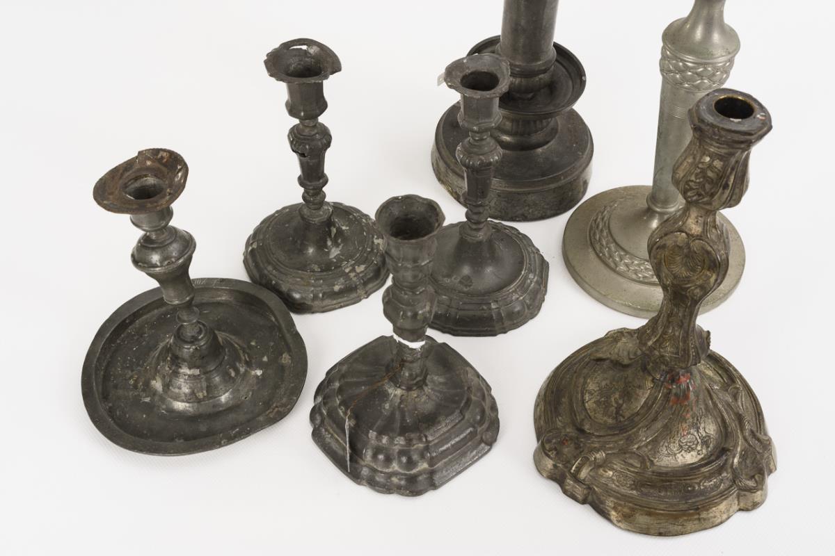 Konvolut 16x Zinn + 1 Bronze- und 1 Nickel-Kerzenleuchter.