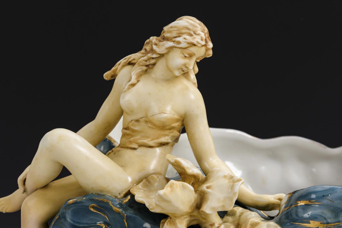An einer unregelmäßig aus Wellen geformten Schale sitzender Frauenakt. Rechtes Bein der Frau restauriert, minimaler Goldabrieb.