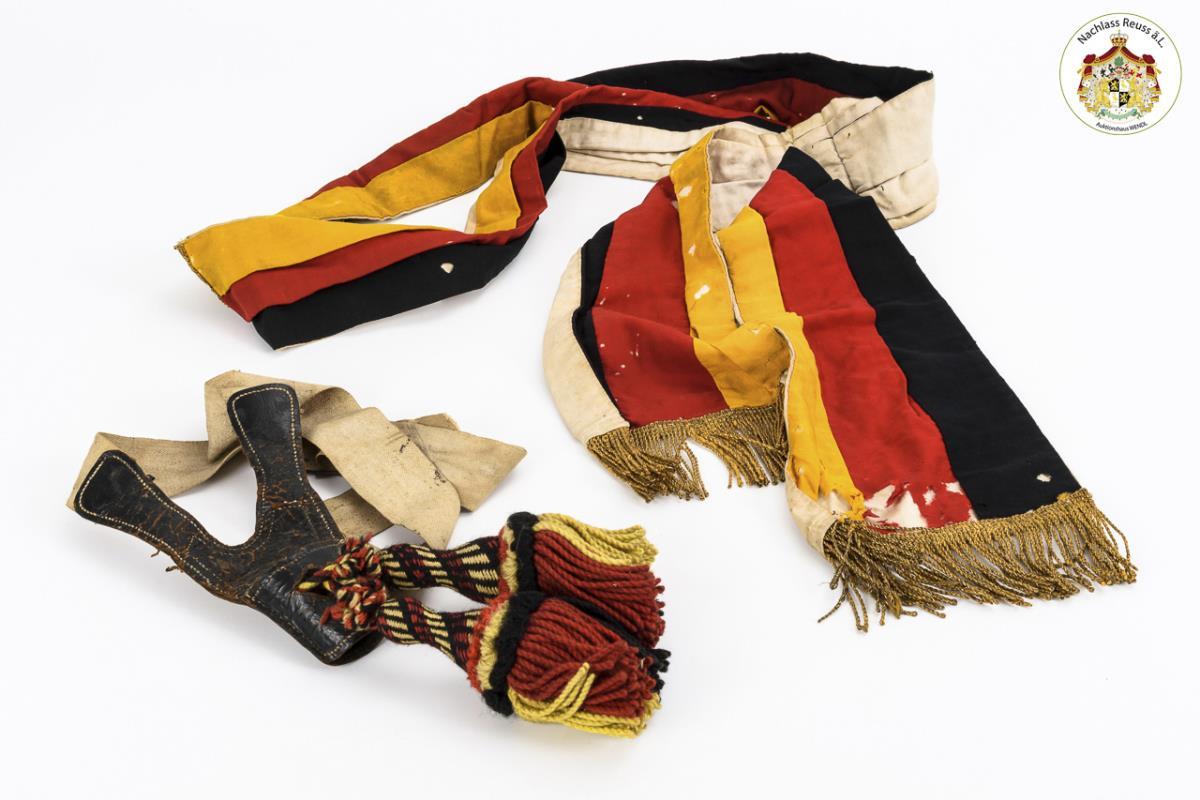 Schwarz-rot-goldene Schärpe und Bandelier mit Quasten.