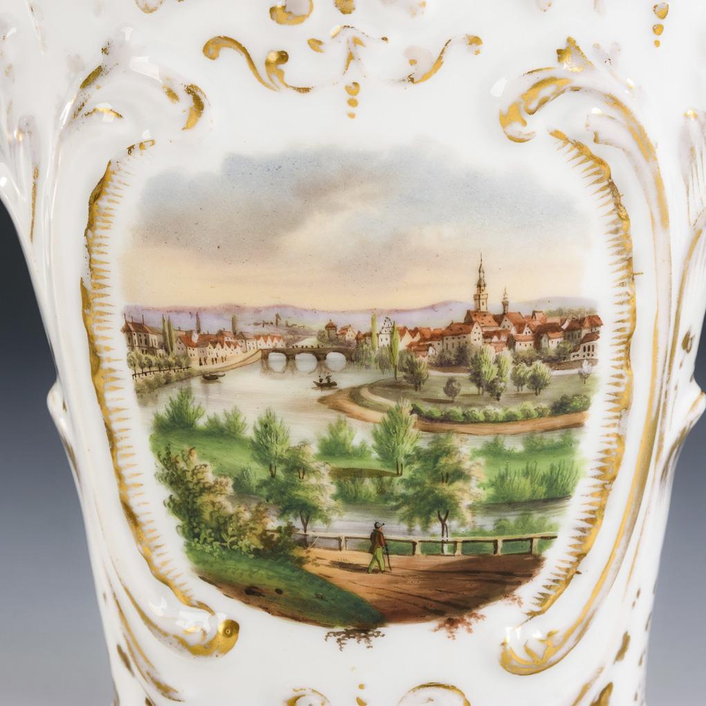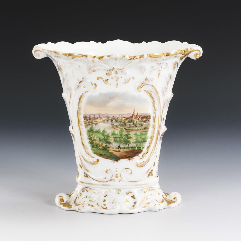 Krater-Plattvase mit Rocaillerelief. Schauseitig die Ansicht von Stuttgart-Bad Cannstatt am Neckar. Gold berieben.