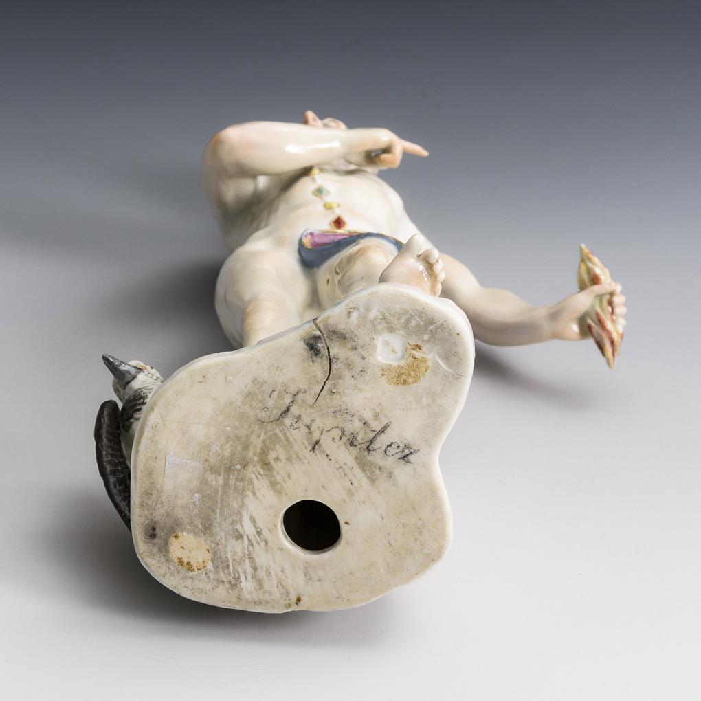 Auf einem Wolkensockel stehender Jupiter mit Krone, Blitzbündel und Adler. Adlerschnabel, Zehen des linken Fußes, rechter Arm, Teil des Lendenschurzes und der Blitze restauriert, Brandriss im Sockel und linken Bein.
