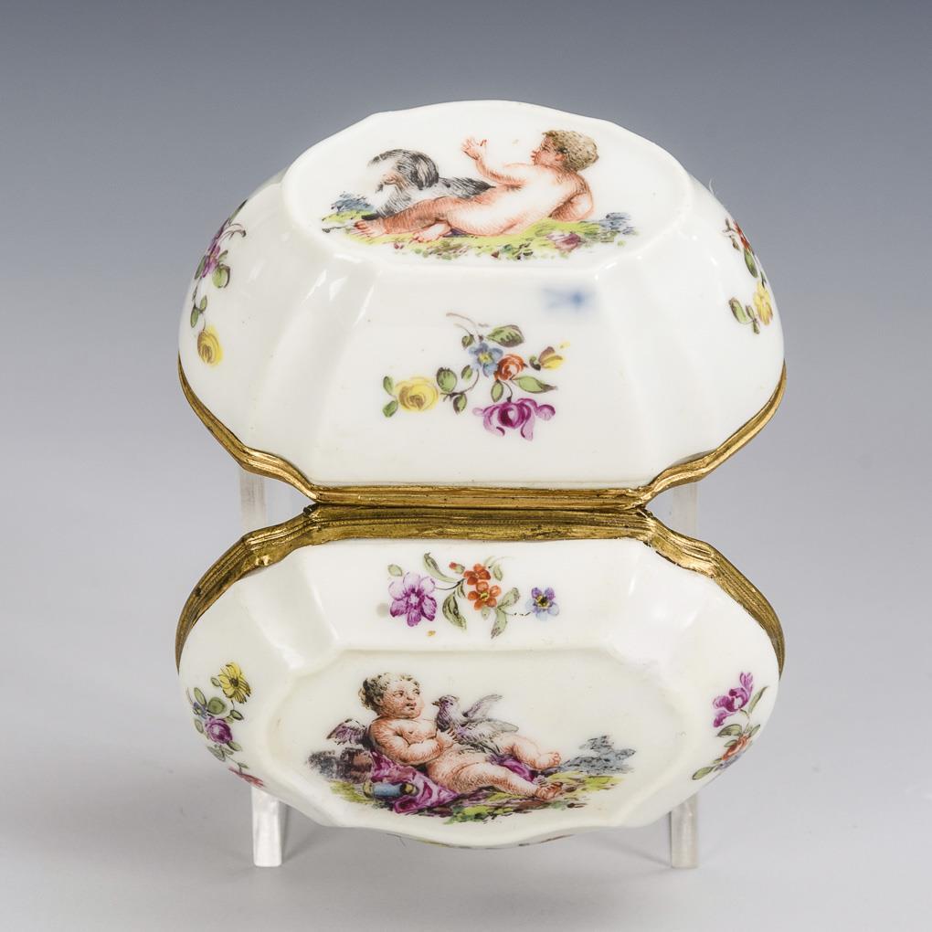 Oval-vierpassige Dose mit messingmontiertem Scharnierdeckel. Bemalt mit auf kleinen Landschaftsinseln lagernden Putten und Blumenbuketts. Deckel restauriert.