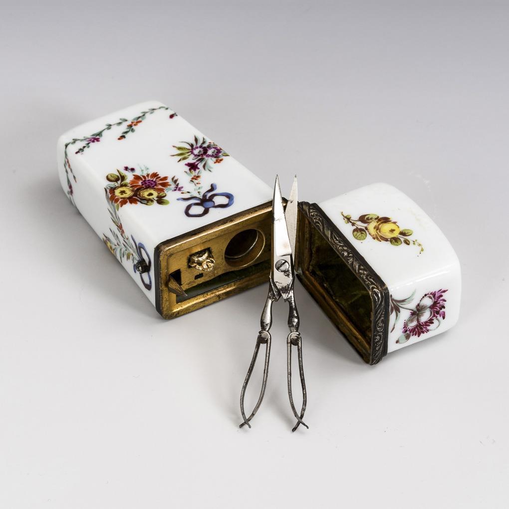 Konisch-rechteckiges Etui mit silbermontiertem Scharnierdeckel (undeutlich gepunzt, geprüft) und polychromer Blumen- und Schleifenmalerei. Mit Schere, Nadelbehälter und Fingerhut.