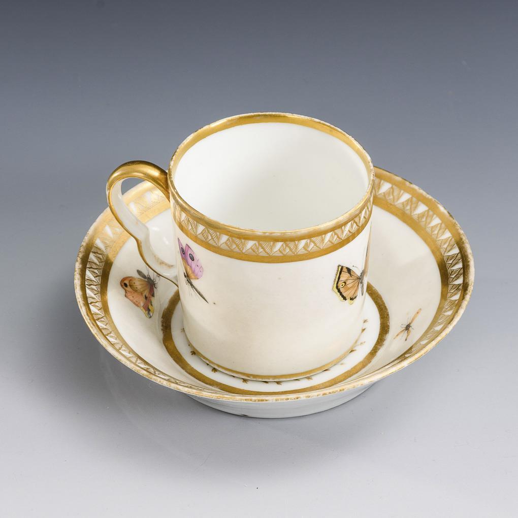 Zylindertasse mit Ohrenhenkel. Umlaufend bemalt mit kleinen Schmetterlingen und Insekten, Goldbordüre. Haarriss am Untertassenrand, Restaurierung am Tassenrand.