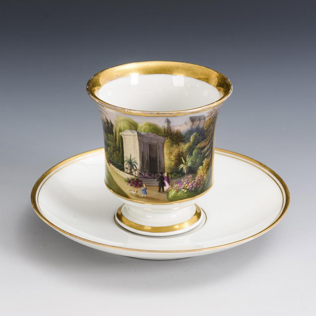 Polychrom bemalt, goldstaffiert. H Tasse 8 cm, Ø ergänzte Untertasse 14,5 cm.