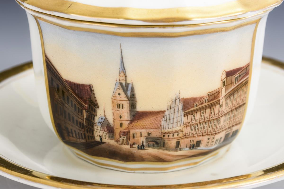 Polygonale Tasse mit Knaufdeckel. Schauseitig eine goldgerahmte Rechteckkartusche mit der unterseitig bezeichneten Ansicht der Marktkirche und des Badhauses in Hannover. 2 Haarrisse und 1 Restaurierung am Tassenrand, Restaurierung am Deckel.