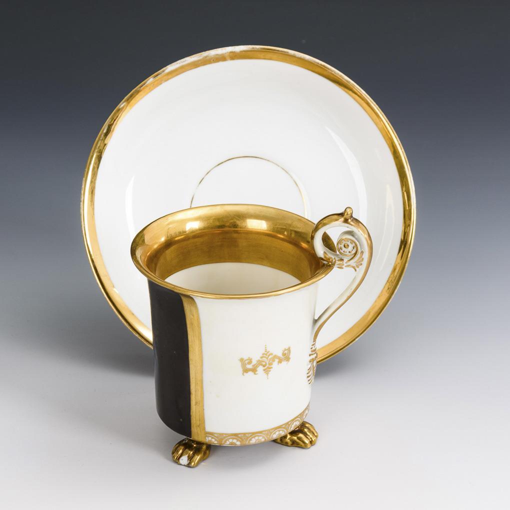 Polychrom bemalt, goldstaffiert. H Tasse 12,5 cm, Ø ergänzte Untertasse 16,5 cm.