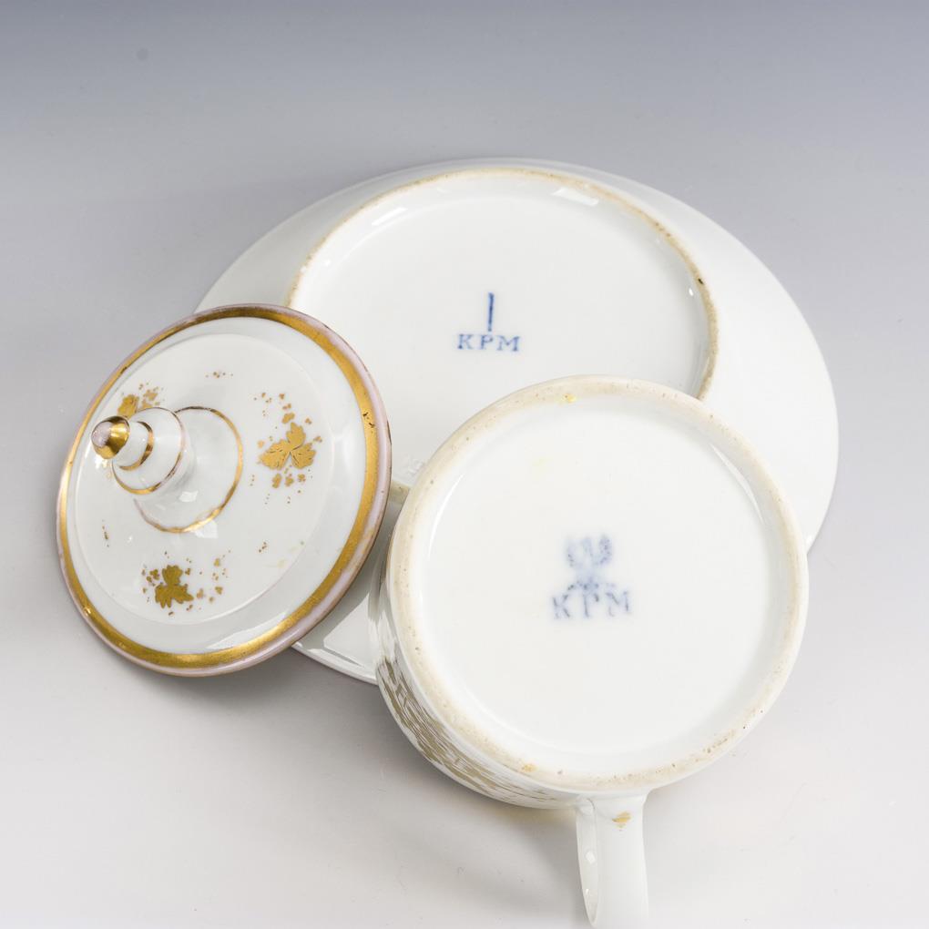 Polychrom bemalt, goldstaffiert. H Tasse 13,5 cm, Ø originale Untertasse 16 cm.