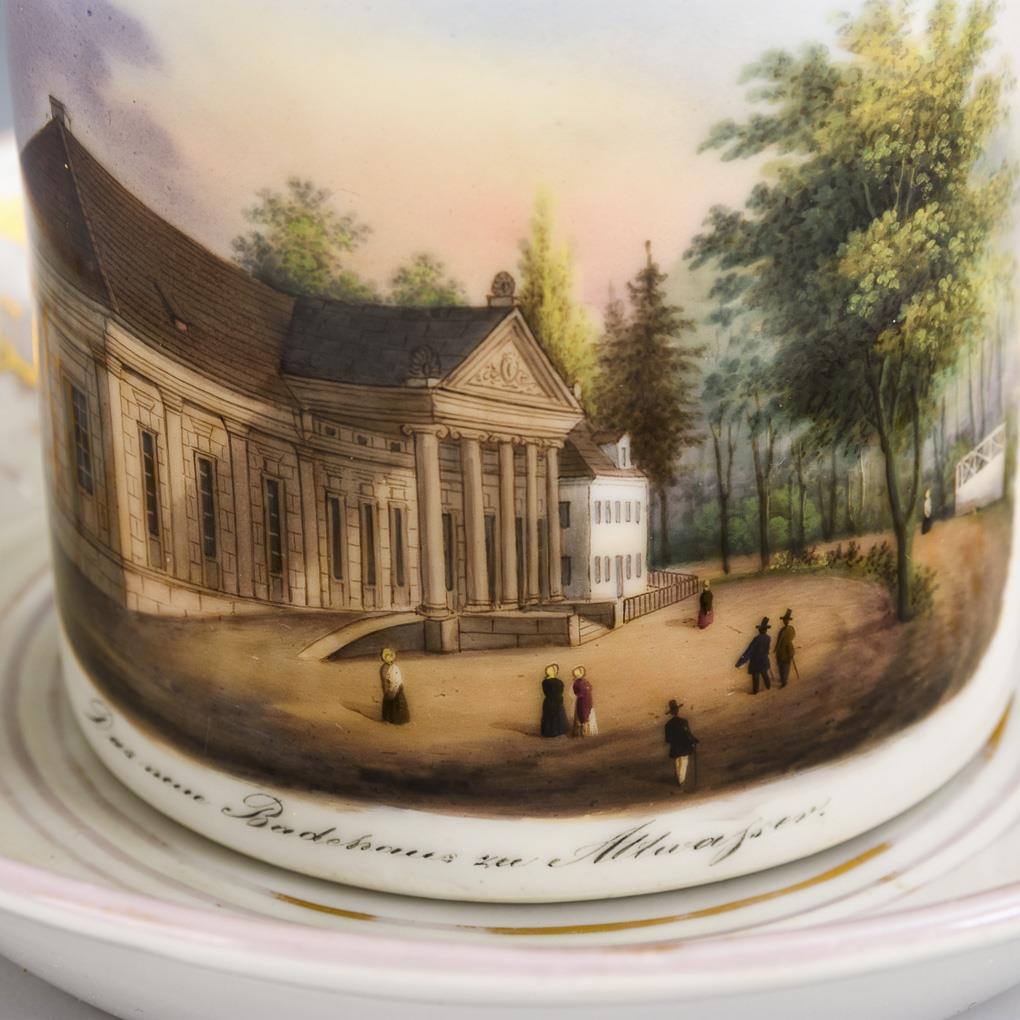 Zylindertasse mit Ohrenhenkel und Knaufdeckel. Schauseitig die bezeichnete Ansicht des neuen Badehauses in Altwasser/Schlesien. Gold berieben.
