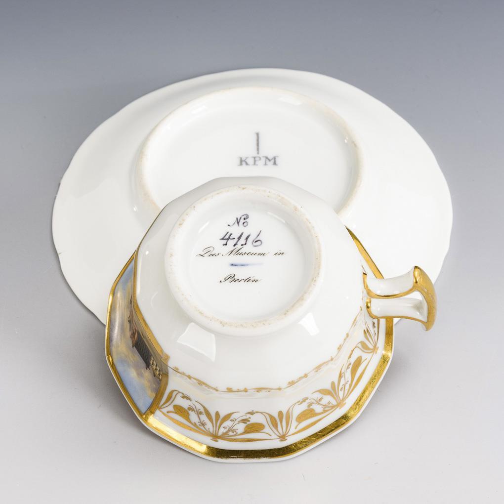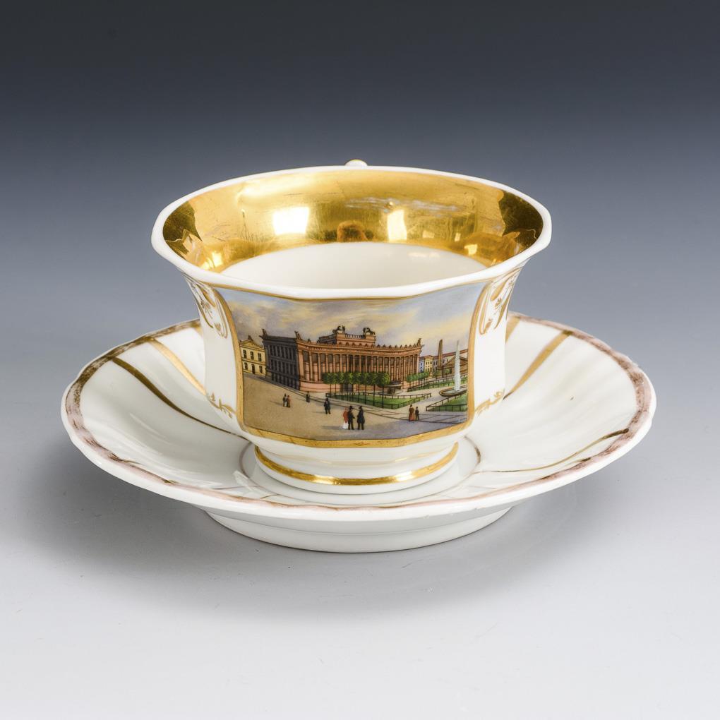 Polygonale, gefußte Glockentasse mit spitz geschweiftem Henkel. Schauseitig eine goldgerahmte Rechteckkartusche mit der Darstellung des Alten Museums in Berlin. Minimaler Goldabrieb.