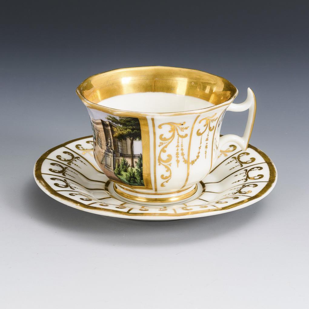 Polychrom bemalt, goldstaffiert. H Tasse 6 cm, Ø originale Untertasse 14,5 cm.
