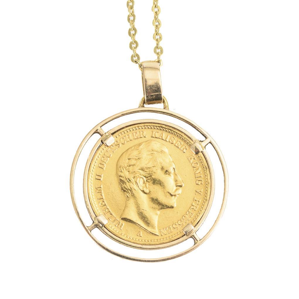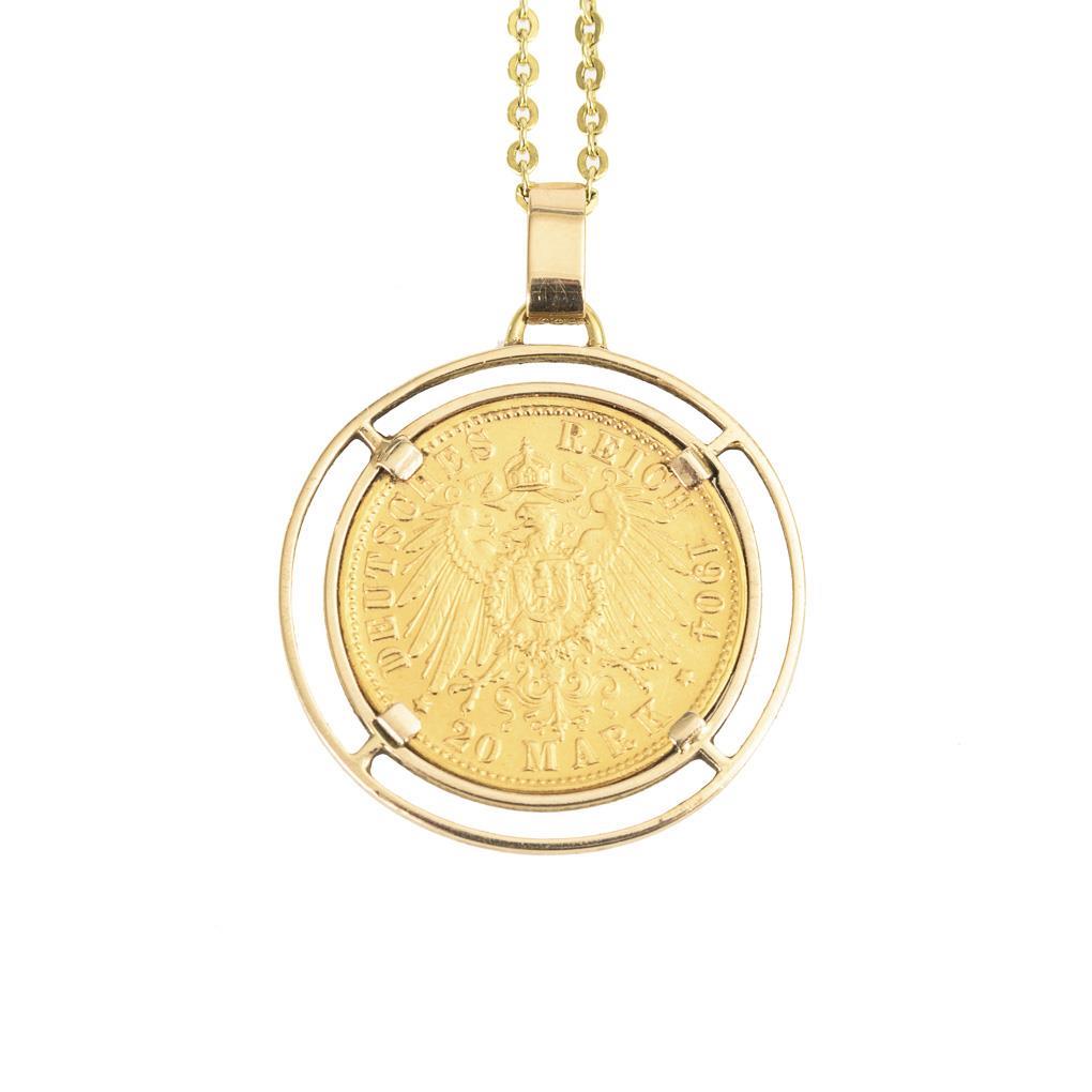 20 Mark Goldmünze Wilhelm II. (Preussen 1904-A), krappengefasst in Stegrahmen, an Ankerkette mit Ringfederschließe.