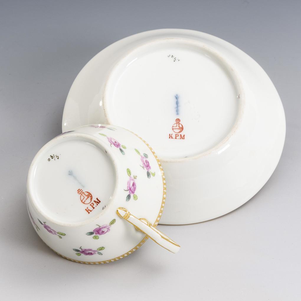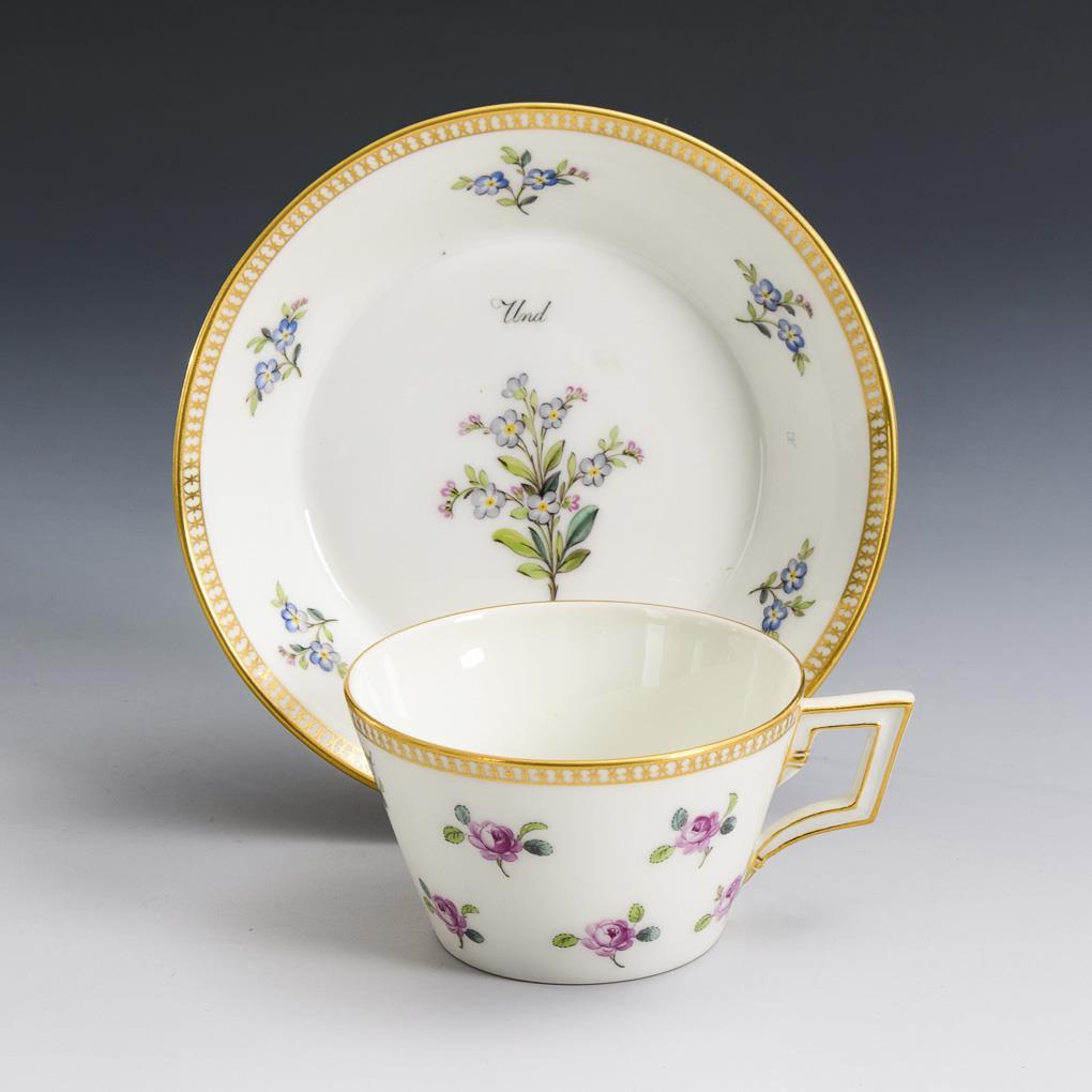 Polychrom bemalt, goldstaffiert. H Tasse 4,5 cm, Ø originale Untertasse 12,5 cm.