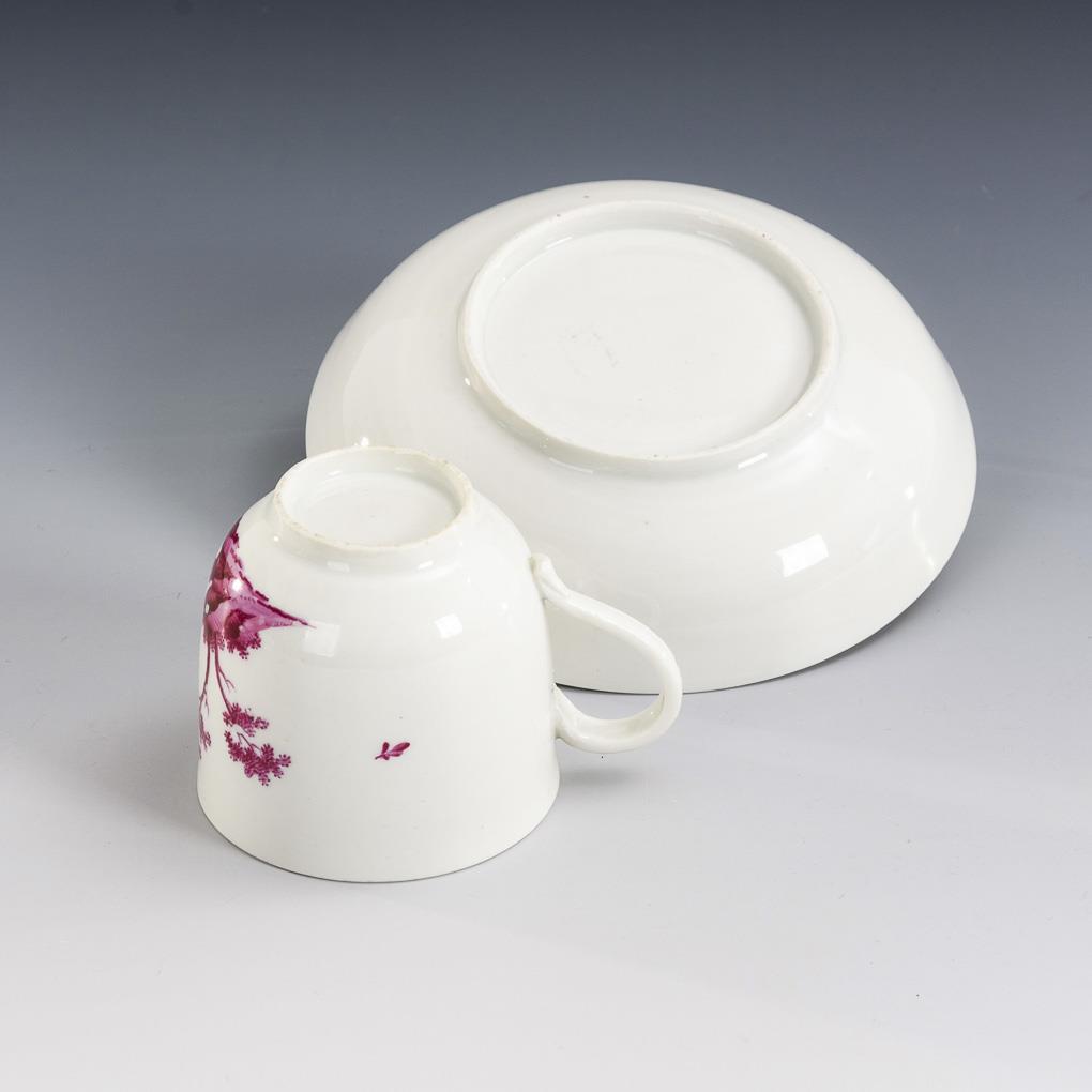 Purpurfarben bemalt, goldstaffiert. H Tasse 6 cm, Ø originale Untertasse 13,5 cm.