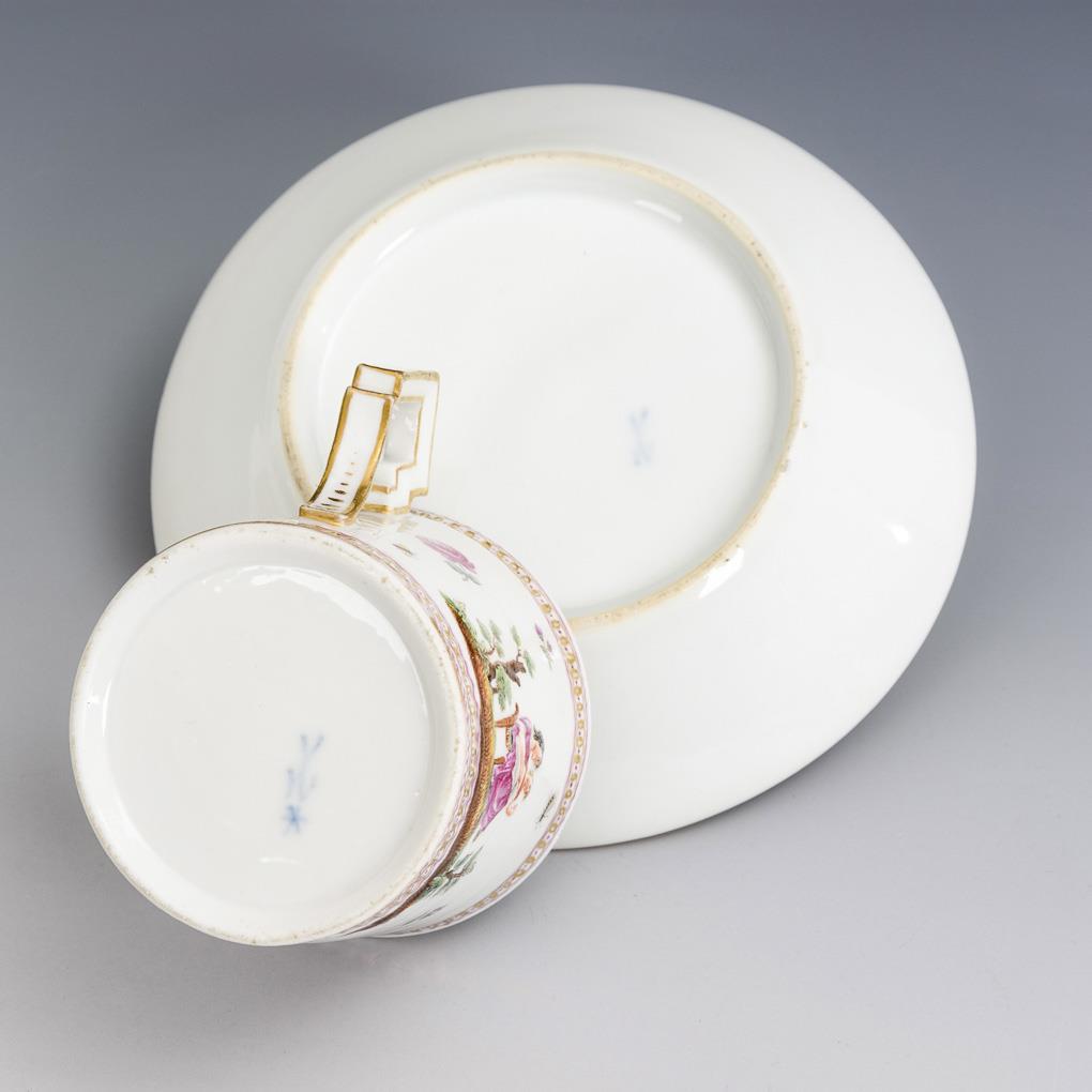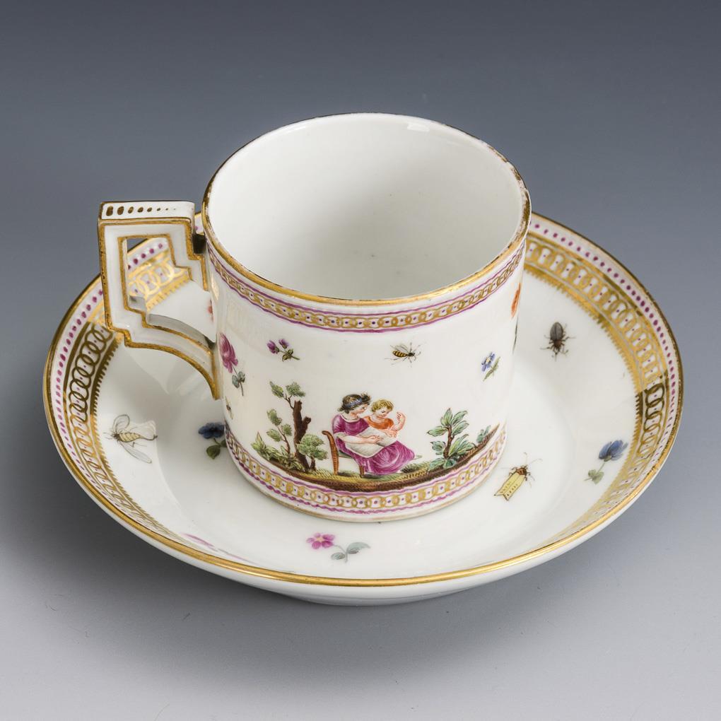 Polychrom bemalt, goldstaffiert. H Tasse 6 cm, Ø originale Untertasse 13,5 cm.