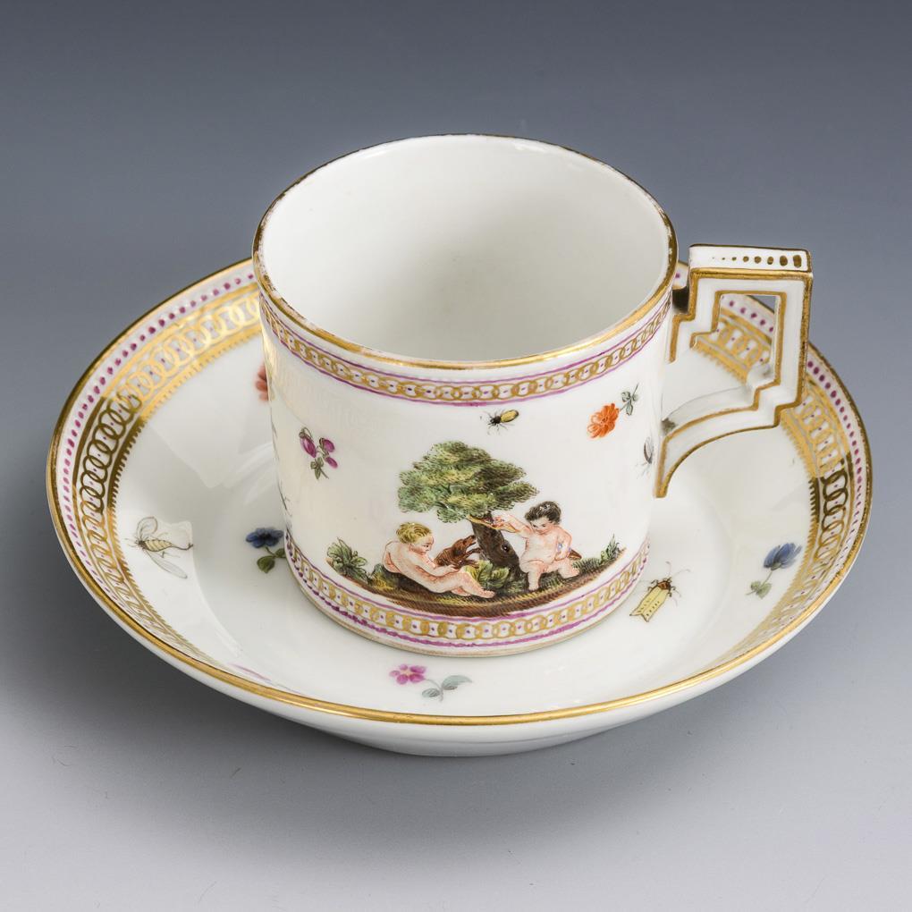 Zylindertasse mit gewinkeltem Henkel. Beidseitig ein Figurenrelief mit Putten bzw. zweier Geschwister, mit Blumen- und Insektenmalerei. Minimaler Goldabrieb.