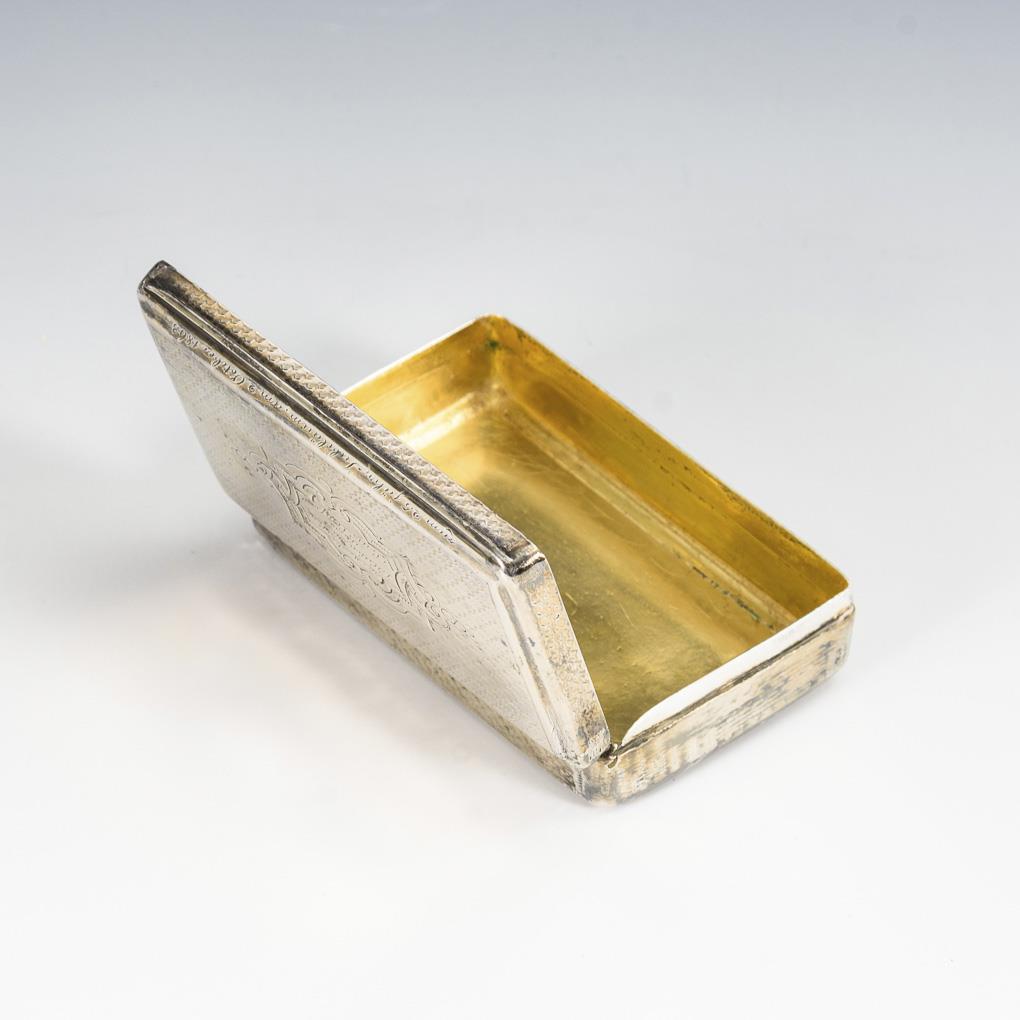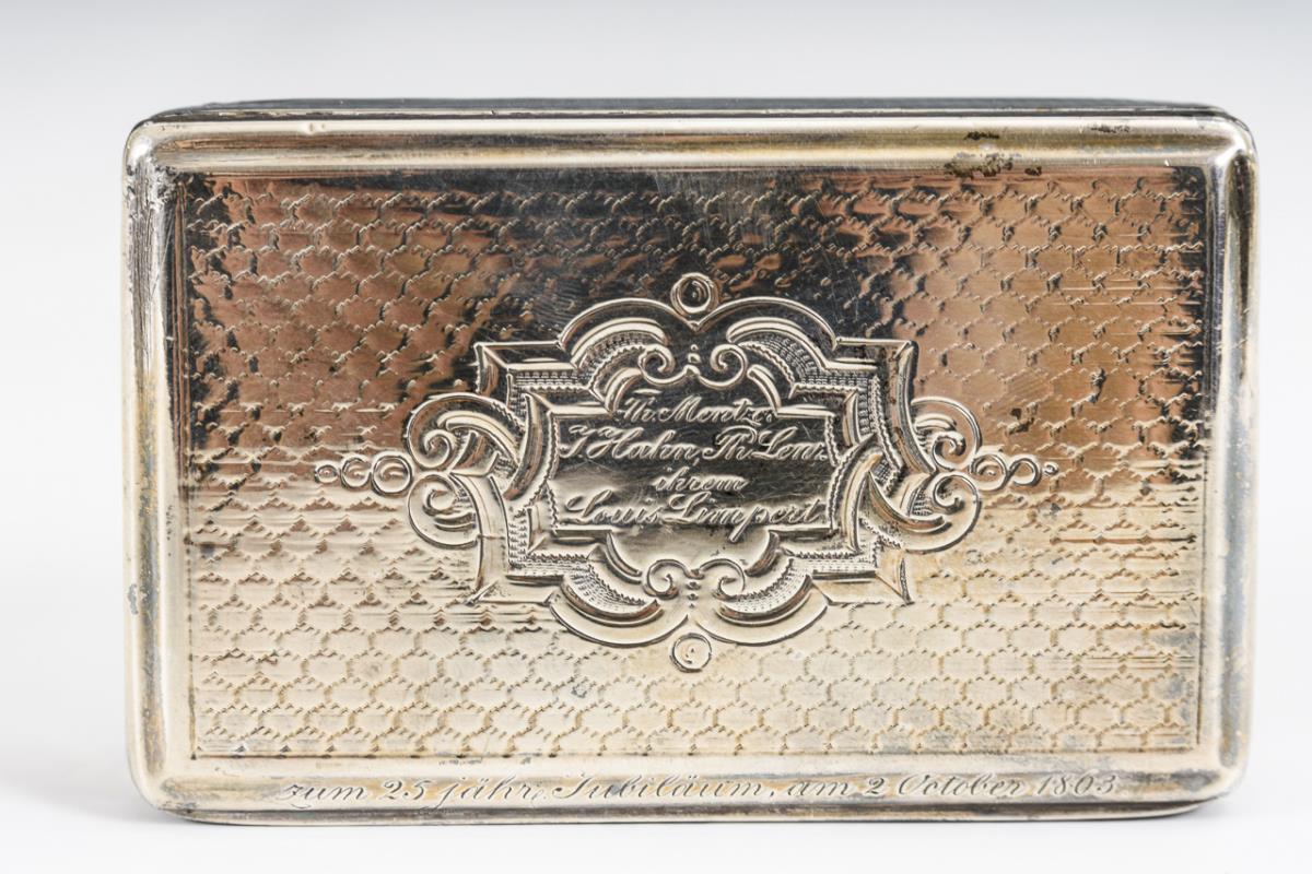 Guillochiertes Döschen mit gravierter Widmung auf dem Scharnierdeckel. Innen vergoldet. Gebrauchsspuren, kleine Dellen, Oberfläche abgegriffen.