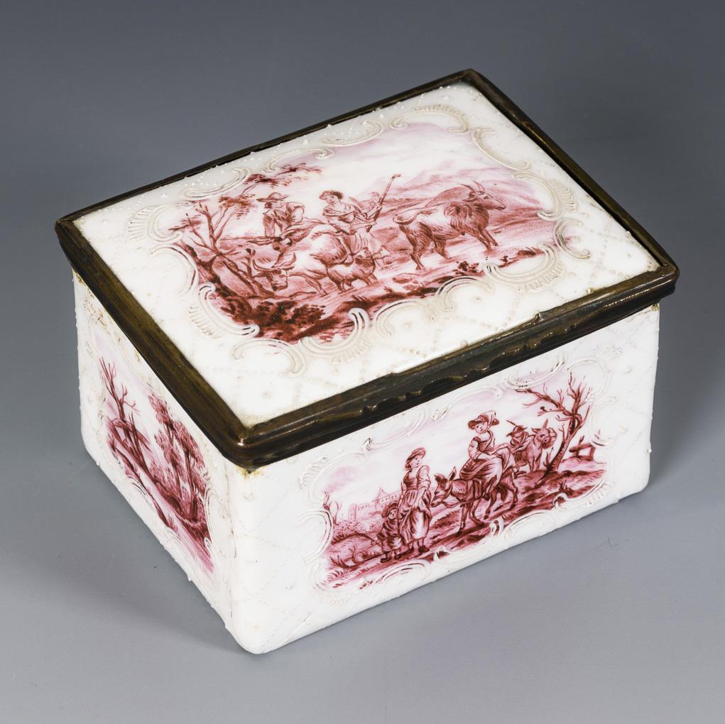 Hohe Quaderdose allseits, auf dem Boden sowie auf und im Deckel mit bukolischen Szenen und Landschaften bemalt. Etwas haarrissig, berieben.