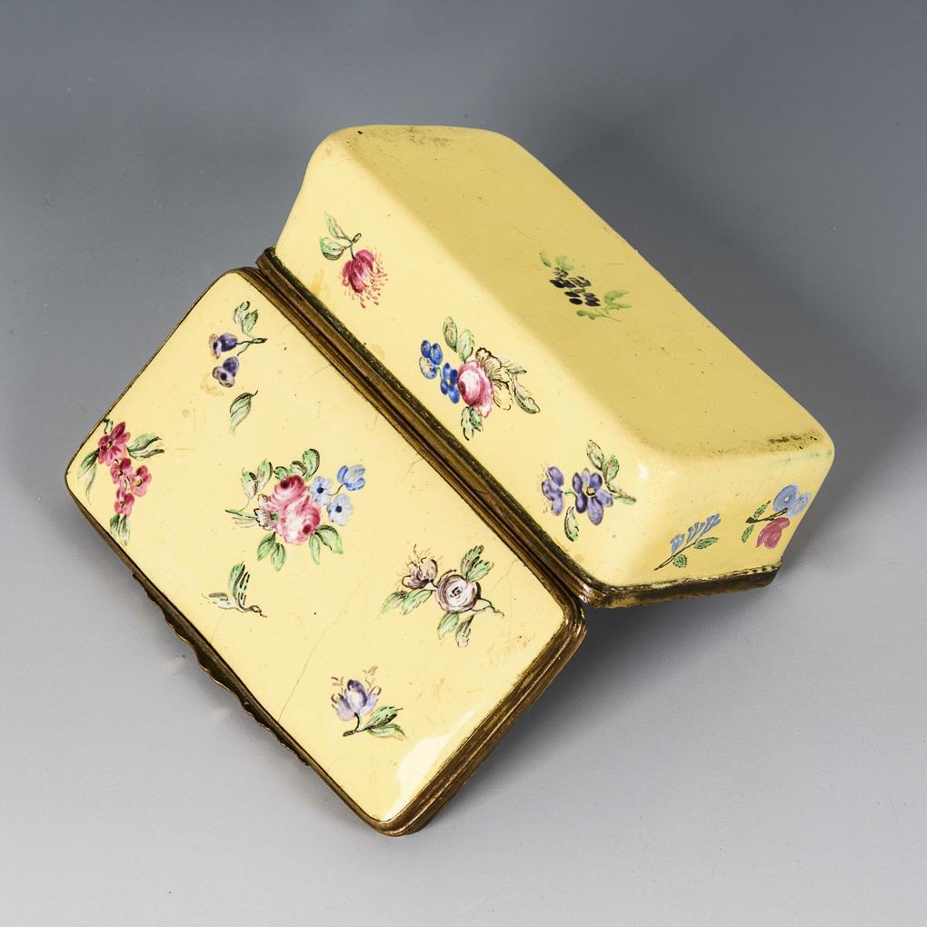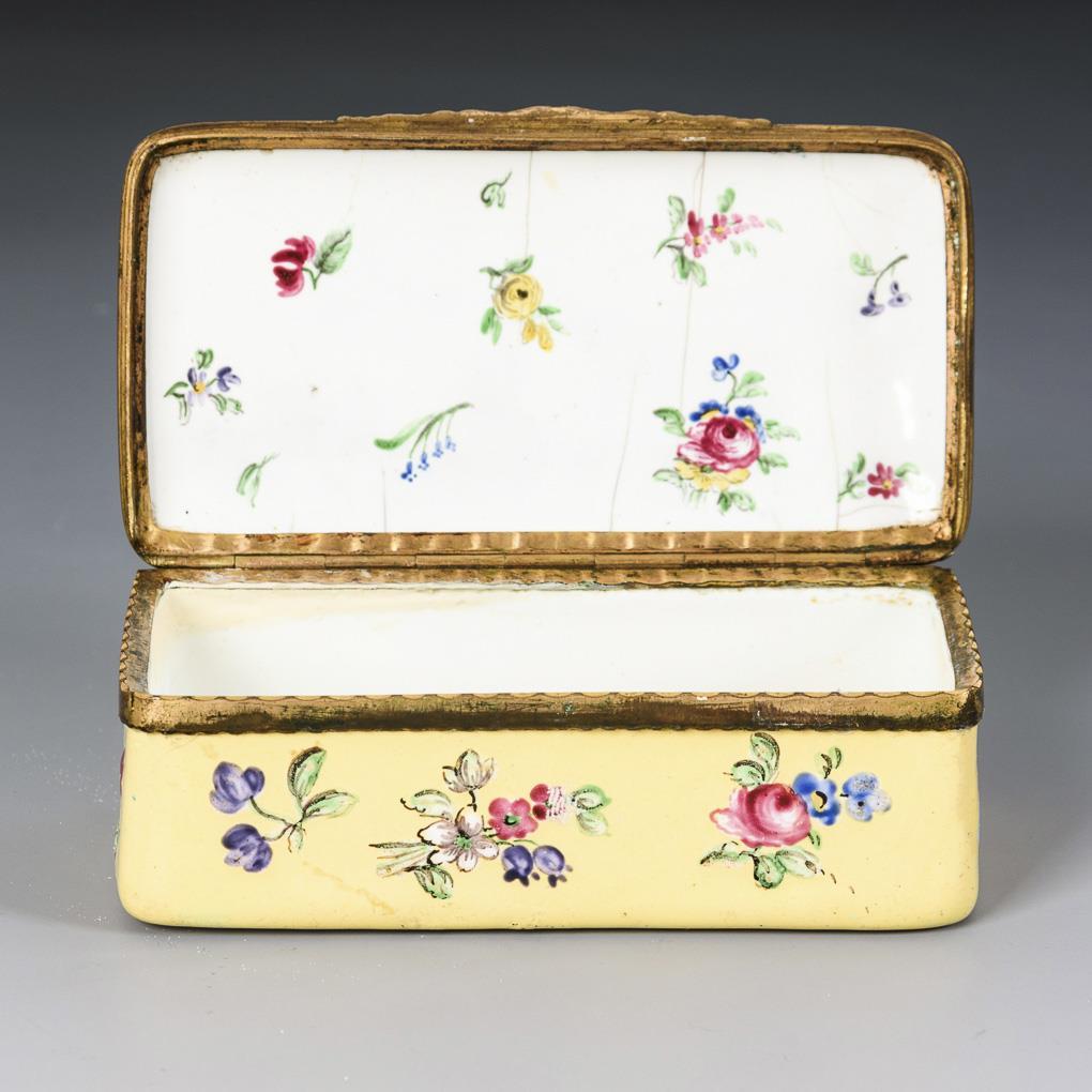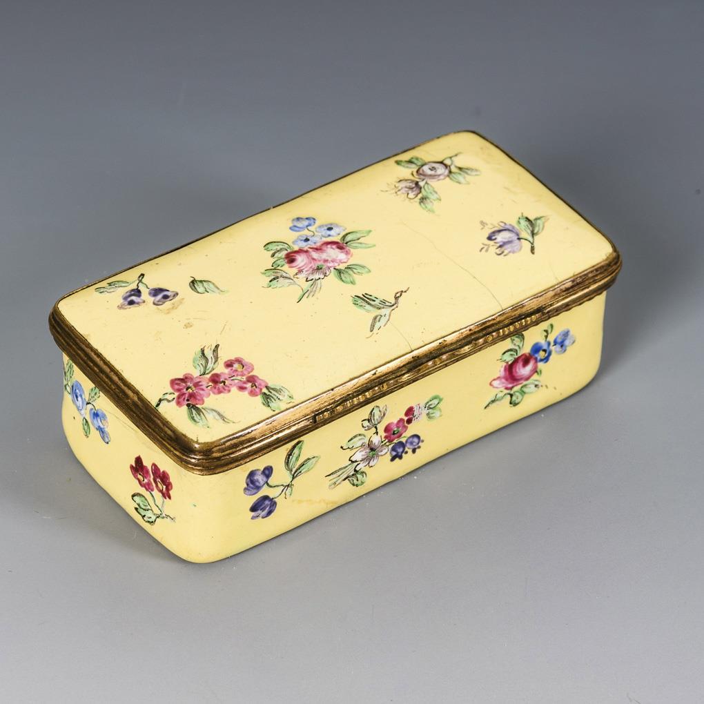 Tabatiere mit gelbem Fond; innen weiß. Allseits, auf dem Deckel und dem Boden sowie im Deckel mit bunten Streublumen bemalt. Etwas haarrissig, berieben.