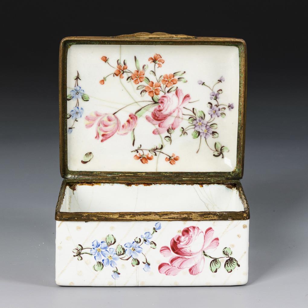 Tabatiere allseits und auf dem Scharnierdeckel mit Blumen über Email-de-Saxe-Rapport bemalt; Blumenmalerei auch im Deckel. Berieben, außen minimale Haarrisse, innen haarrissig.