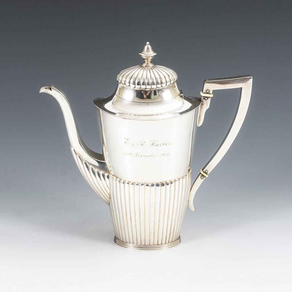 Elegante Kanne mit teilgeripptem Korpus und gewinkeltem Henkel, vom englischen Klassizismus inspiriert. Mit schauseitiger Namensgravur und Datierung. Wenige kleine Dellen.