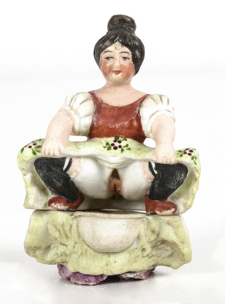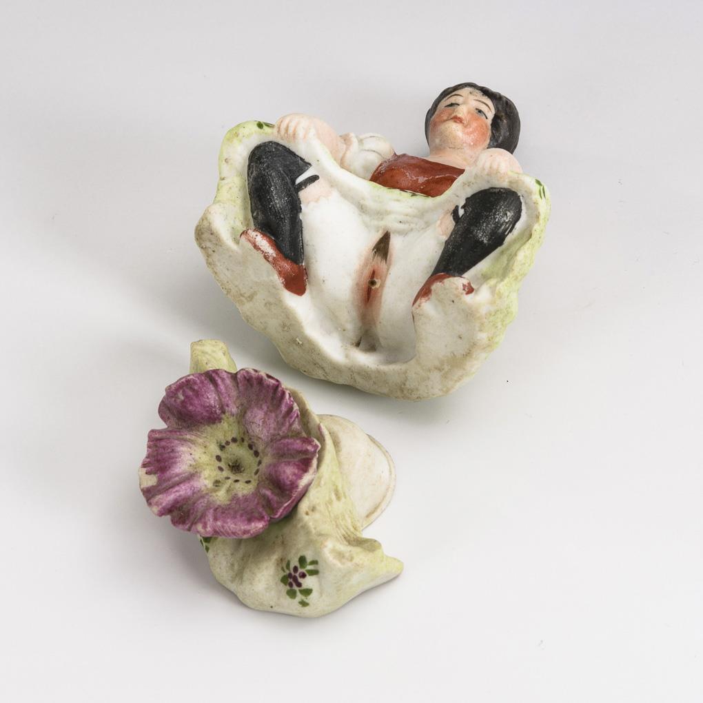 Vor einer großen Blüte hockende, den Rock raffende Frau. Hals restauriert, Bestoßung an 1 Blütenblatt.
