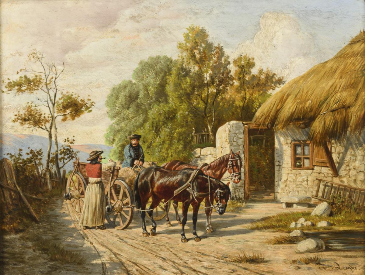 Kutscher am Morgen im Gespräch mit einem Bauern auf der Straße.