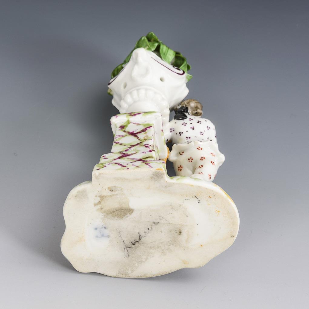 An einem Postament mit Vase stehender Rokokoherr, Holz zum Verkauf anbietend. Beine und Blattspitzen restauriert.